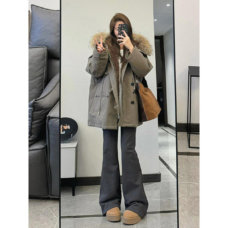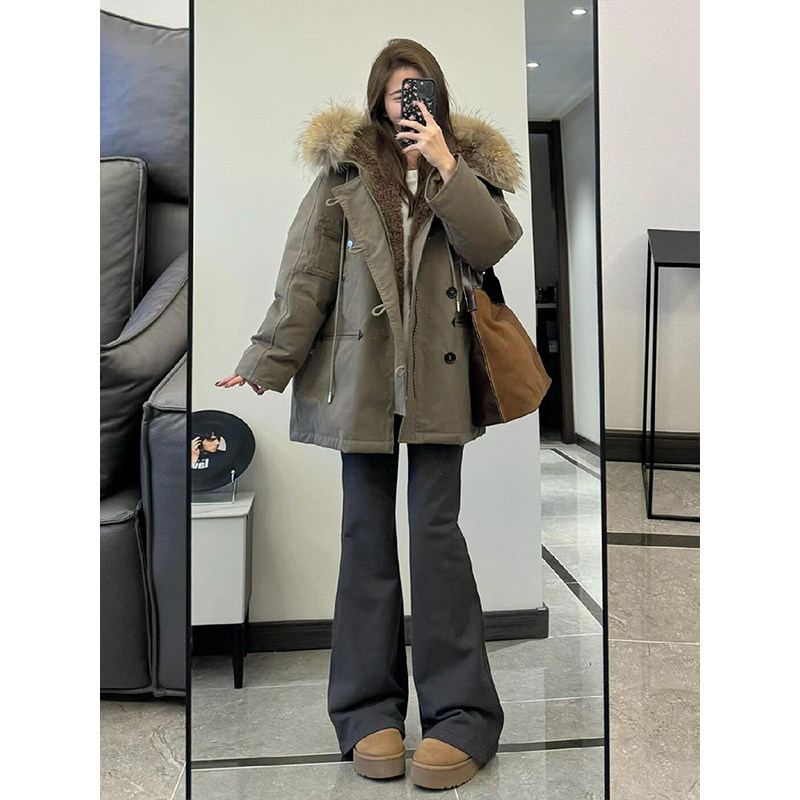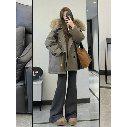 大码女装大毛领工装加绒派克棉服女胖mm时尚洋气加厚保暖显瘦外套