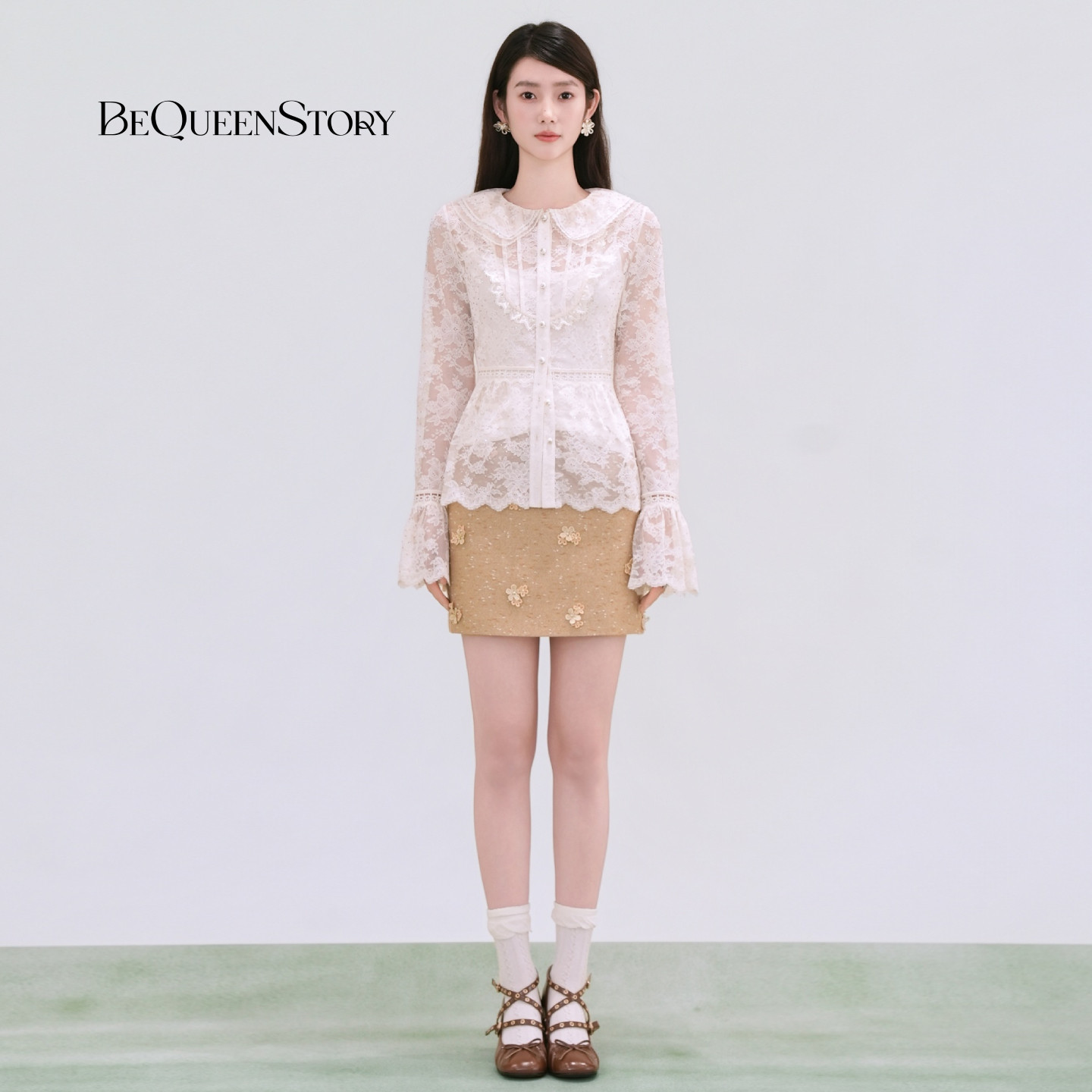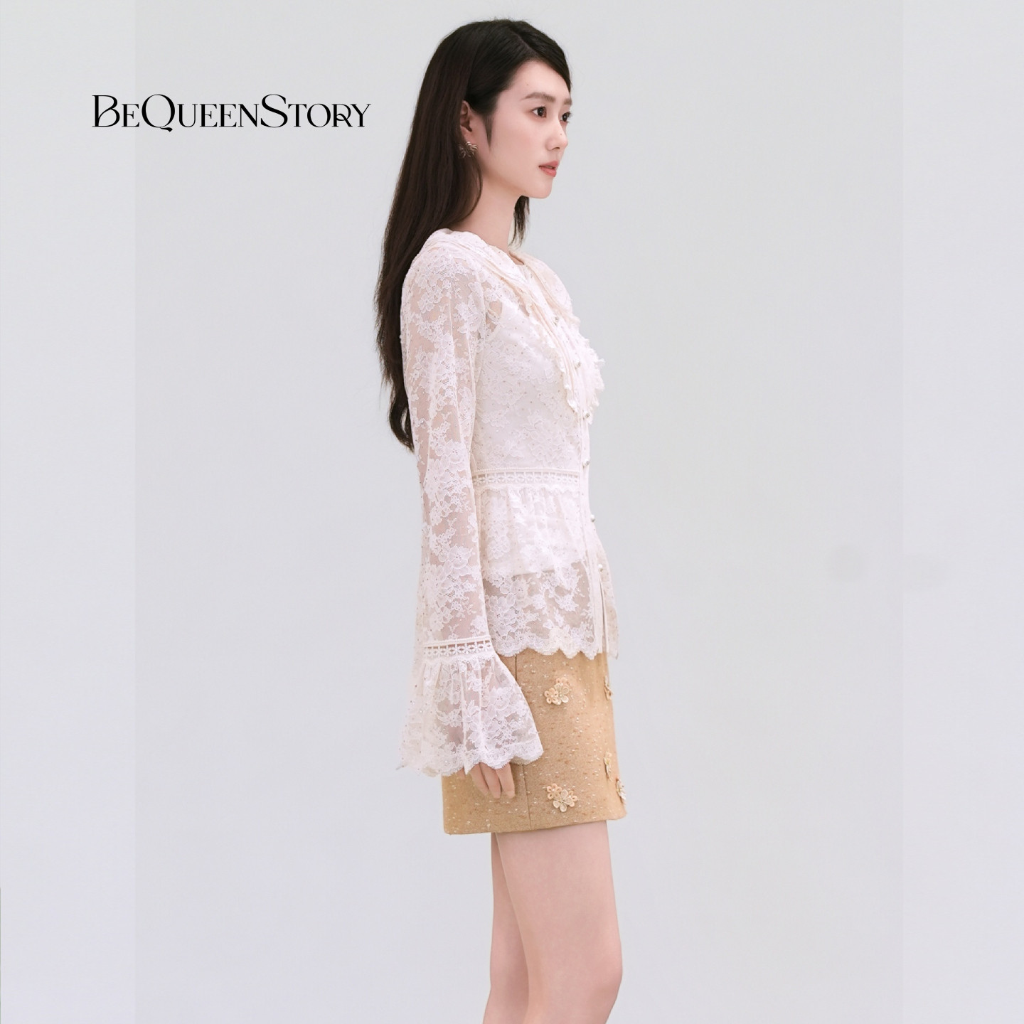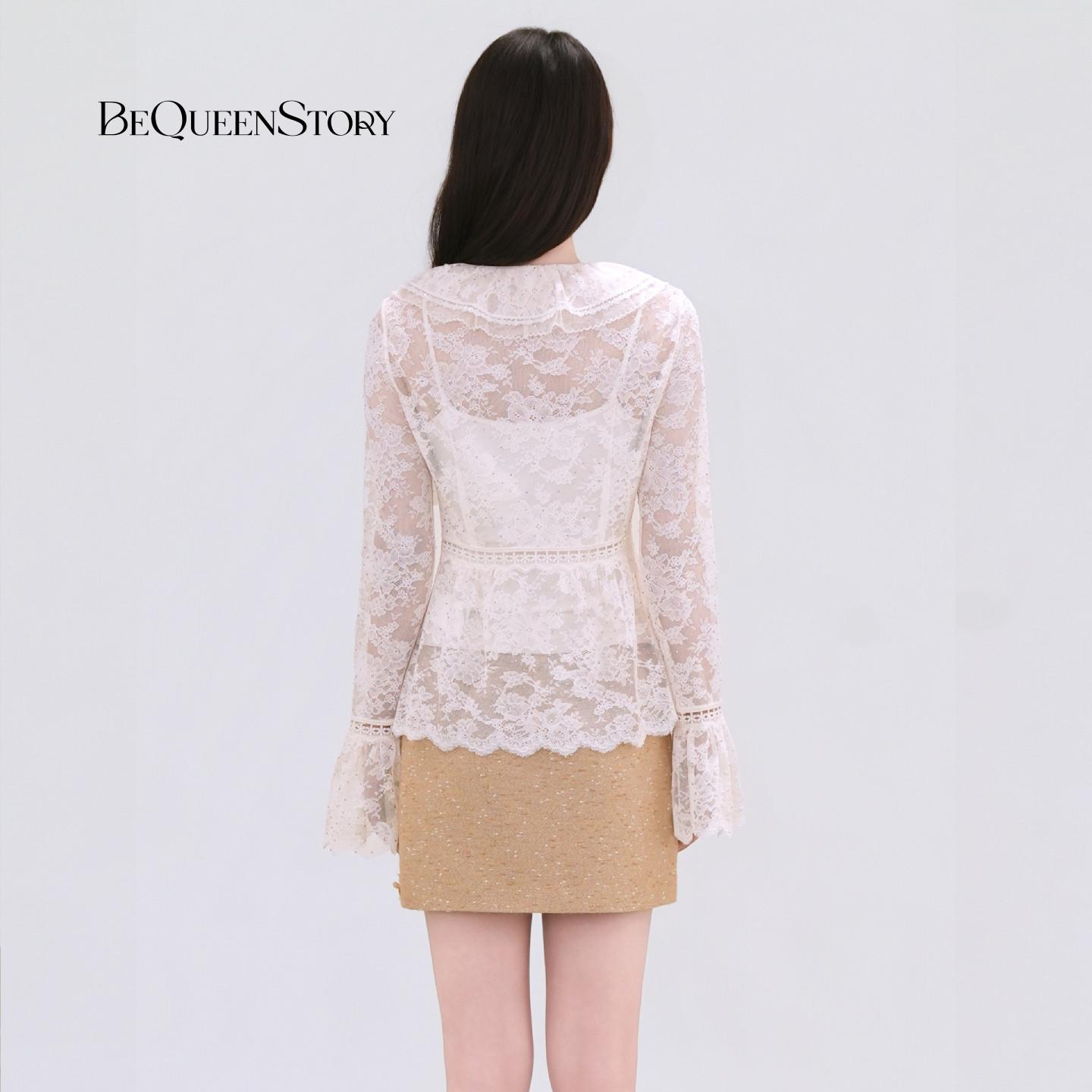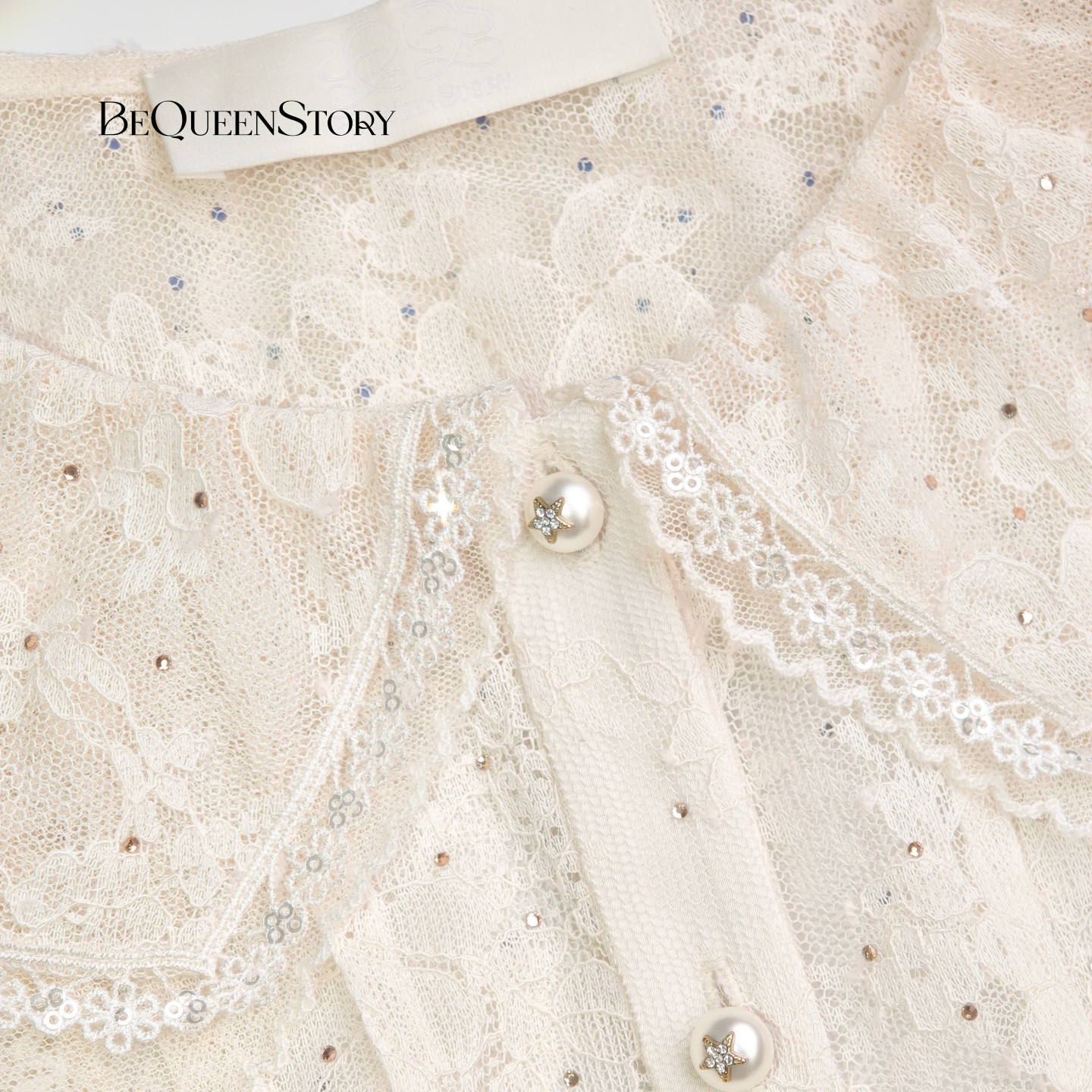 BeQueenStory26早春新款白娃娃领镂空蕾丝烫钻收腰木耳边衬衫上衣