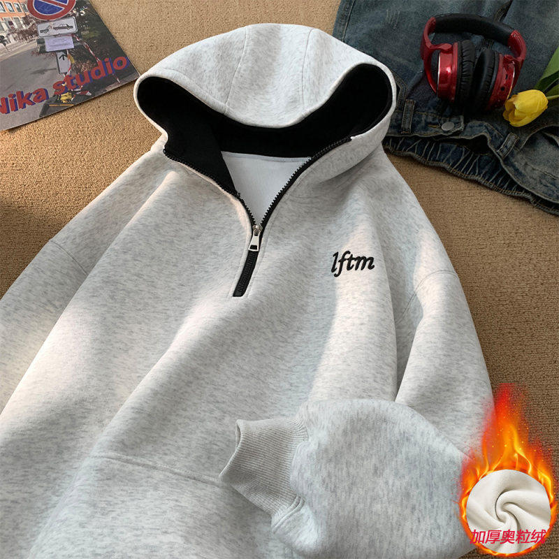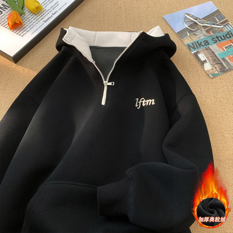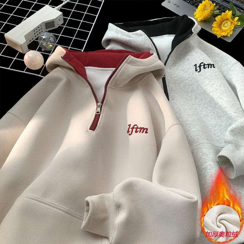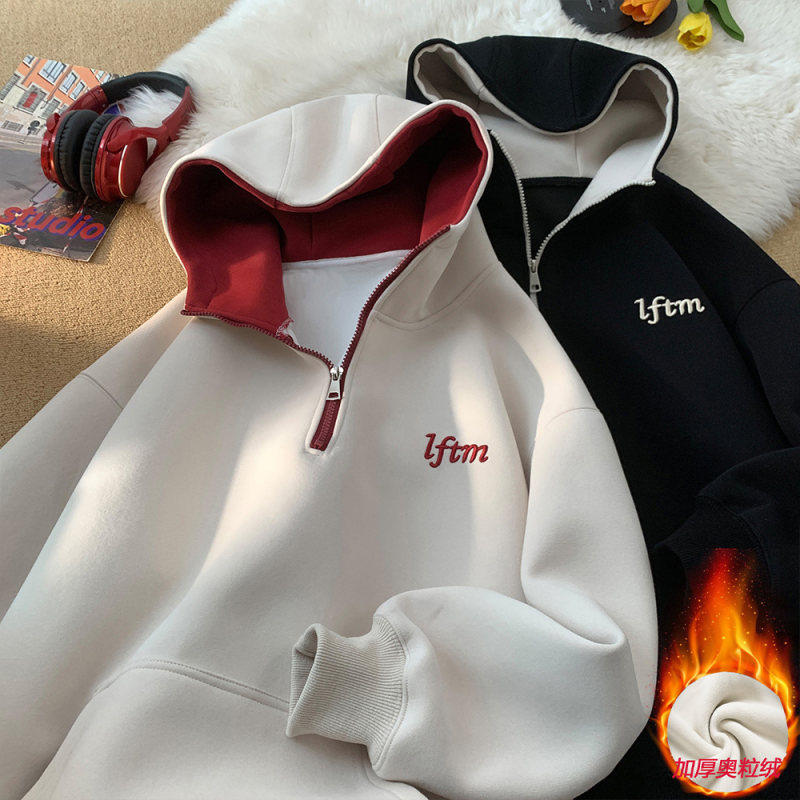 冬季加绒加厚连帽卫衣男士潮流秋冬款字母刺绣撞色宽松情侣装外套