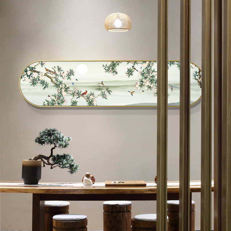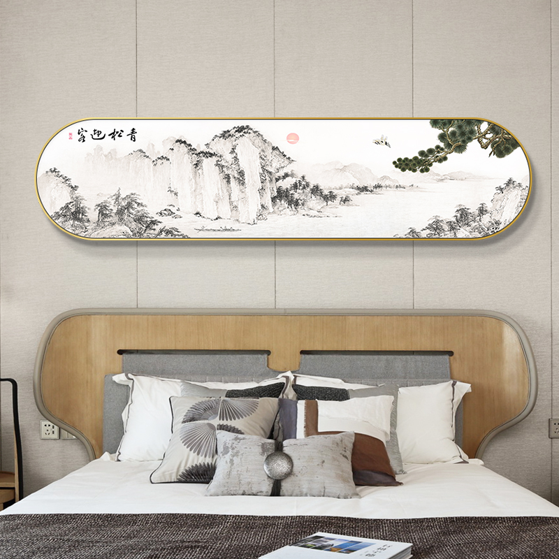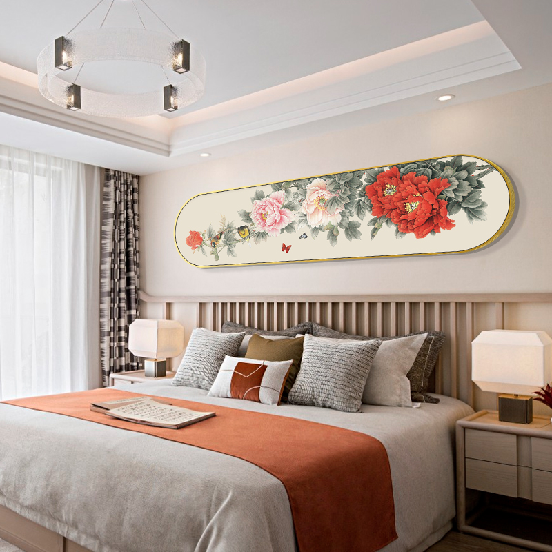 新中式客厅沙发背景墙画跑道形框装饰画卧室床头牡丹花开富贵挂画