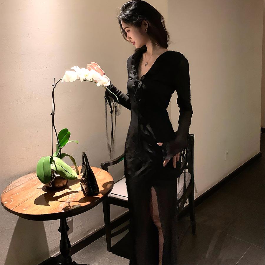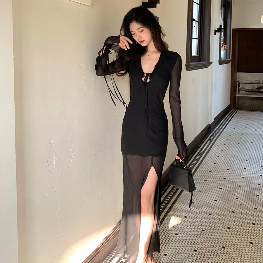 Norain不下雨 黑色性感镂空绑带雪纺连衣裙女春纯欲收腰开叉长裙