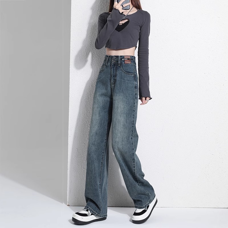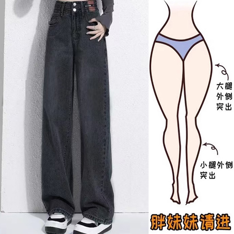 黑灰色直筒阔腿牛仔裤女2025春秋新款高腰大码宽松显瘦窄版拖地裤