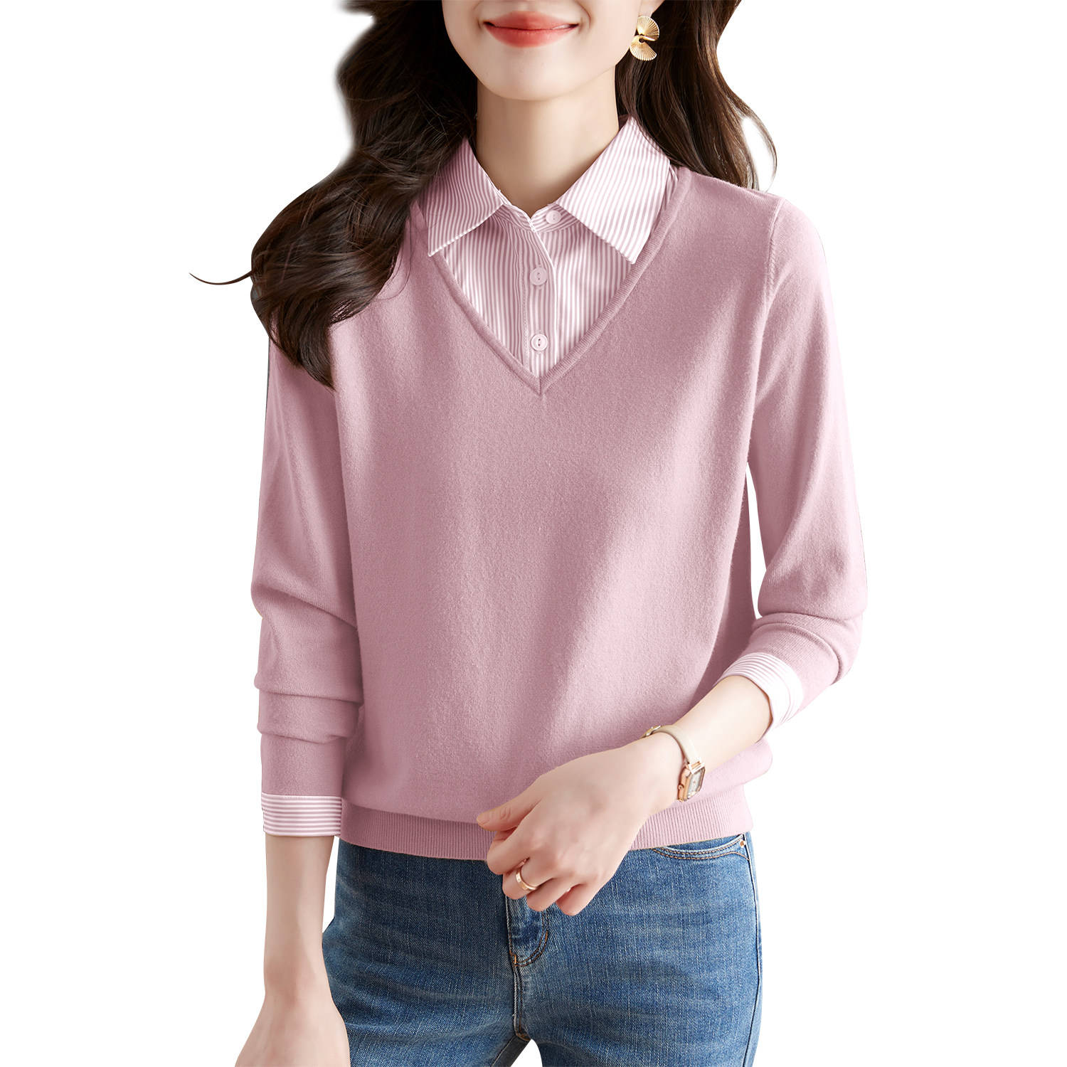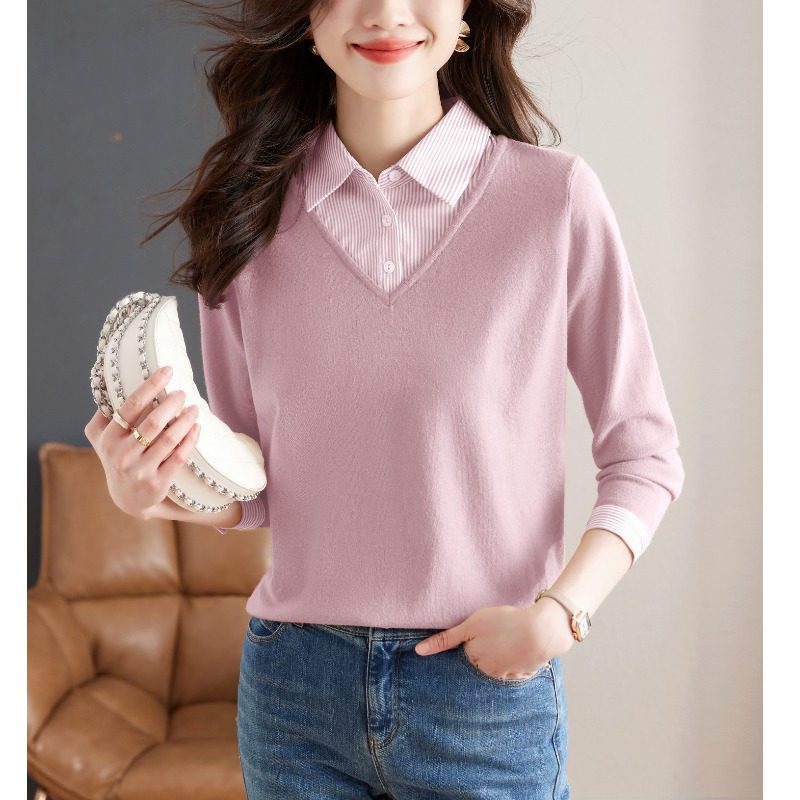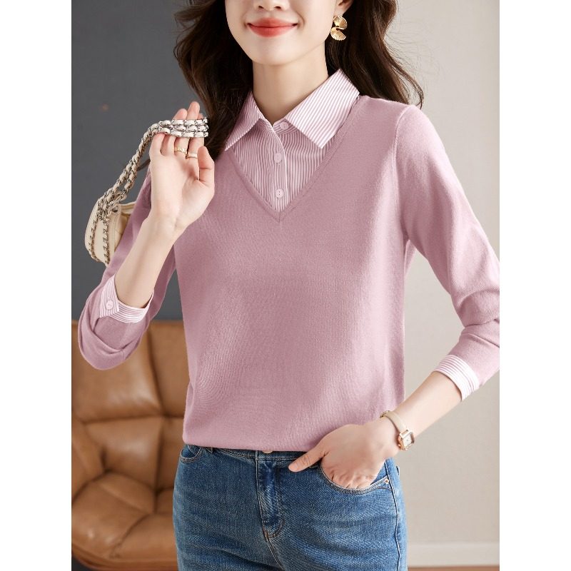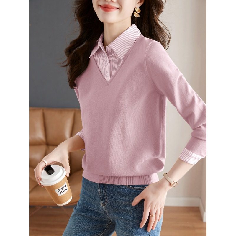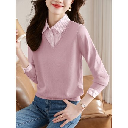 假两件针织衫女2025秋装新款时尚洋气衬衫领拼接长袖毛衣打底上衣