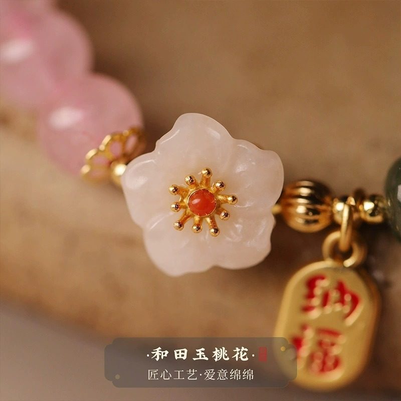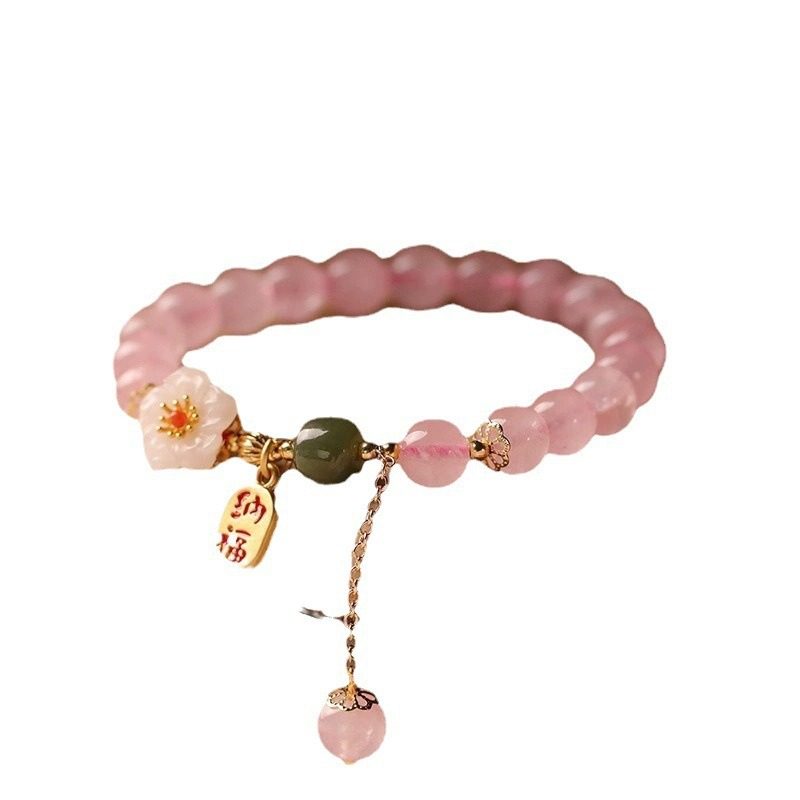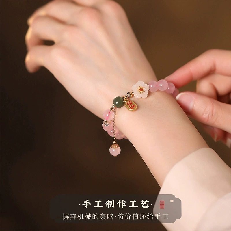 粉水晶手串女款粉色水晶和田玉串珠国风桃花手链闺蜜小众七夕礼物