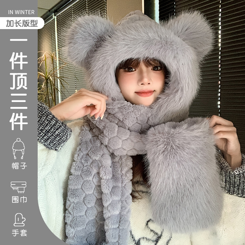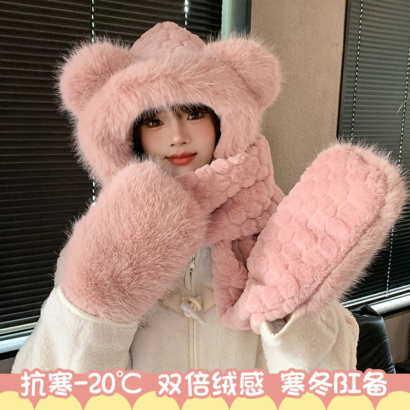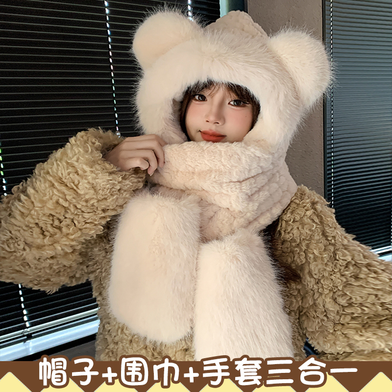 小熊毛绒帽子围巾一体女款冬季可爱秋冬款三件套冬天保暖2025新款