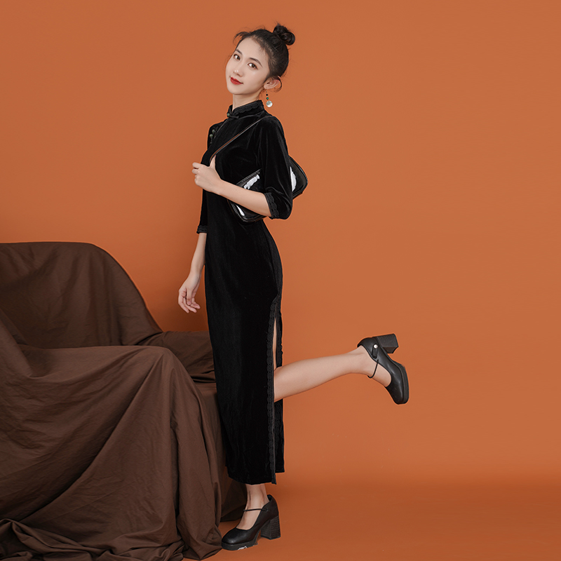 旗袍新款2025女年轻款金丝绒国风复古民国女装黑色盘扣改良连衣裙