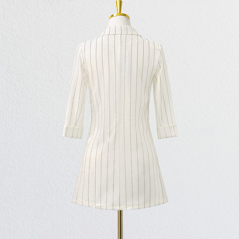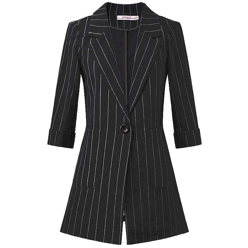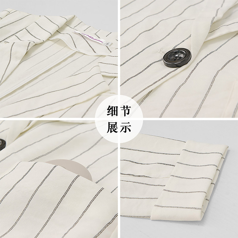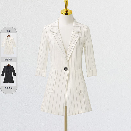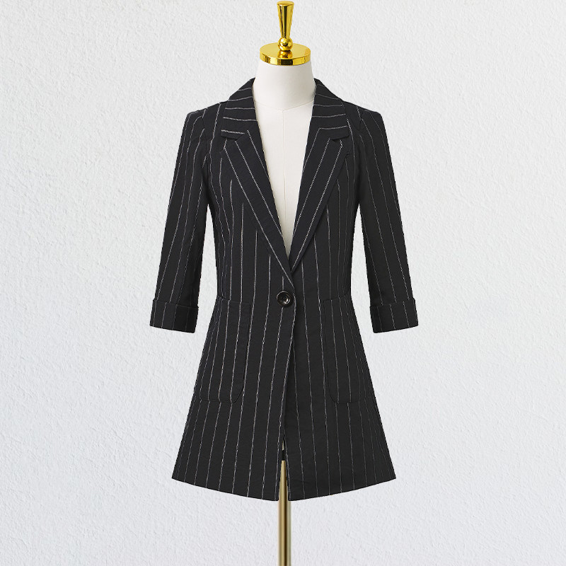 休闲百搭条纹西装外套黑色气质收腰七分袖中长款仿棉麻外搭西服女