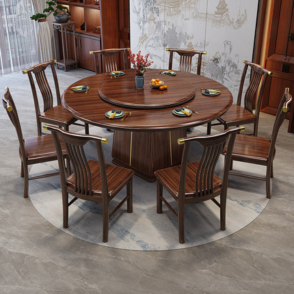 新中式乌金木实木圆桌餐桌椅组合带转盘圆形家用餐厅酒店饭店桌子