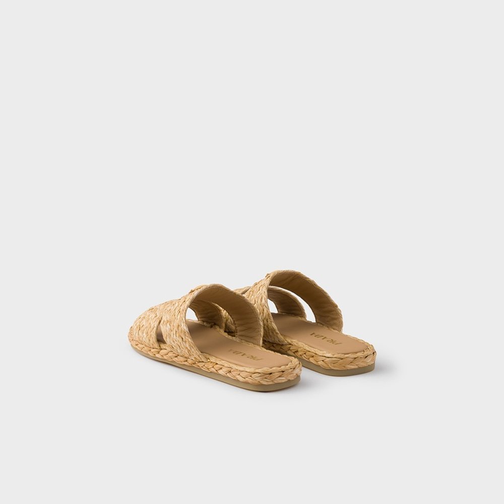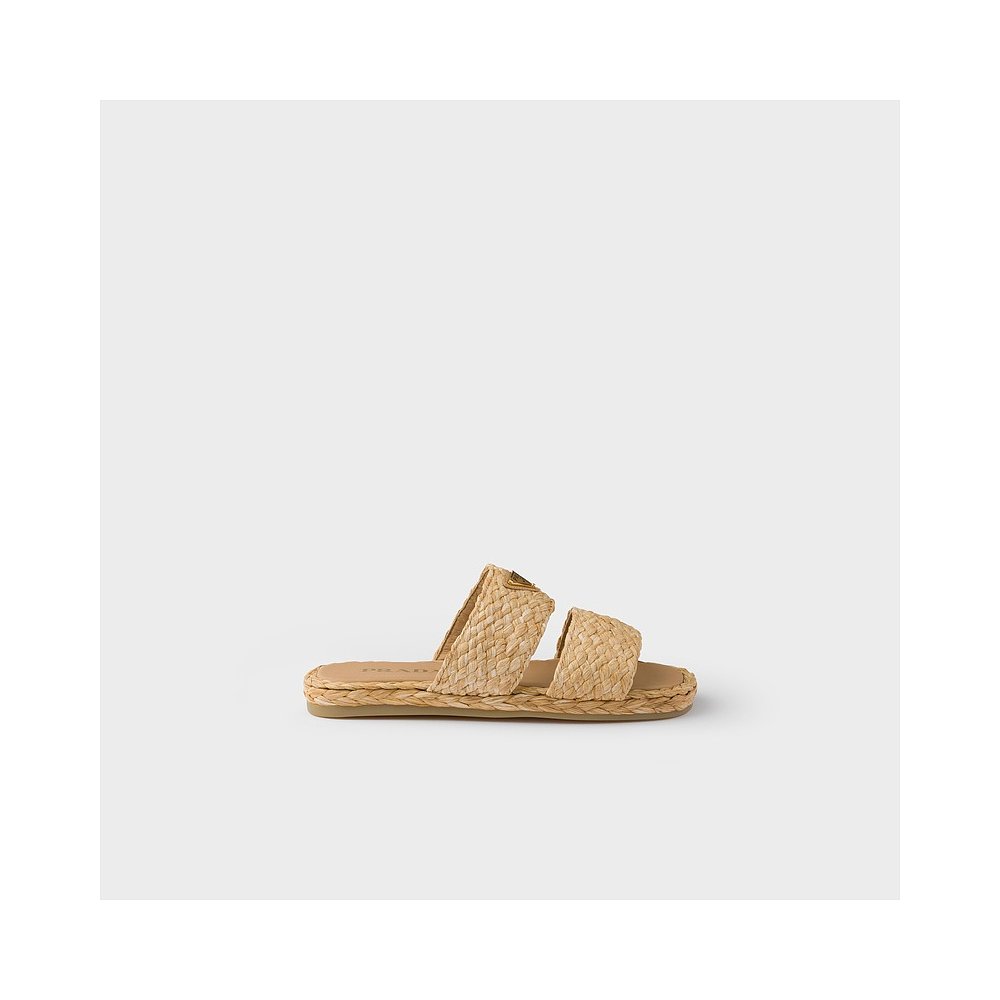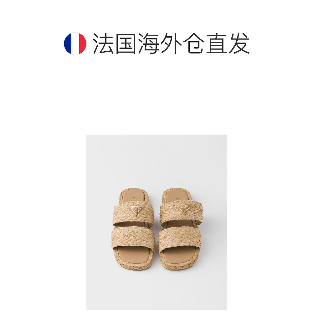 自营欧洲直邮Prada普拉达 女士自然色拉菲草金属三角标识穆勒鞋