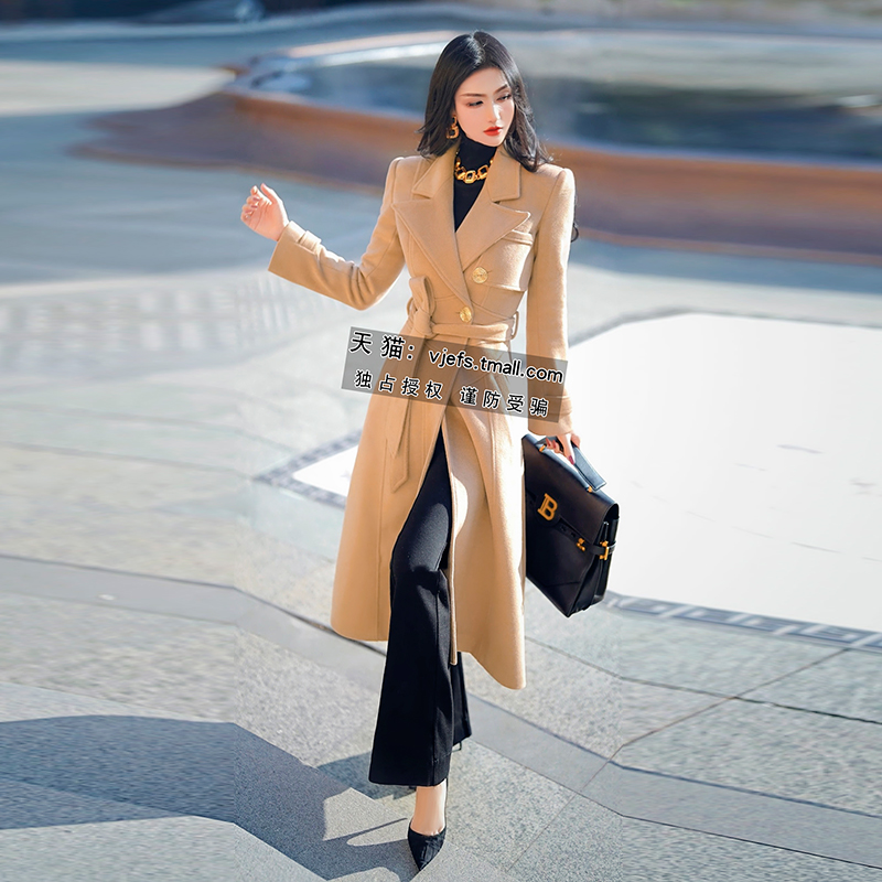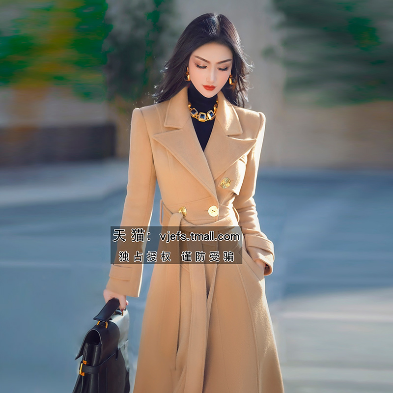 VJE冬季西装式呢大衣女新款双排扣收腰显瘦中长款A摆毛呢外套