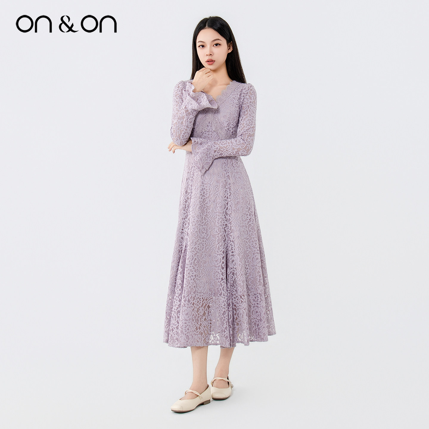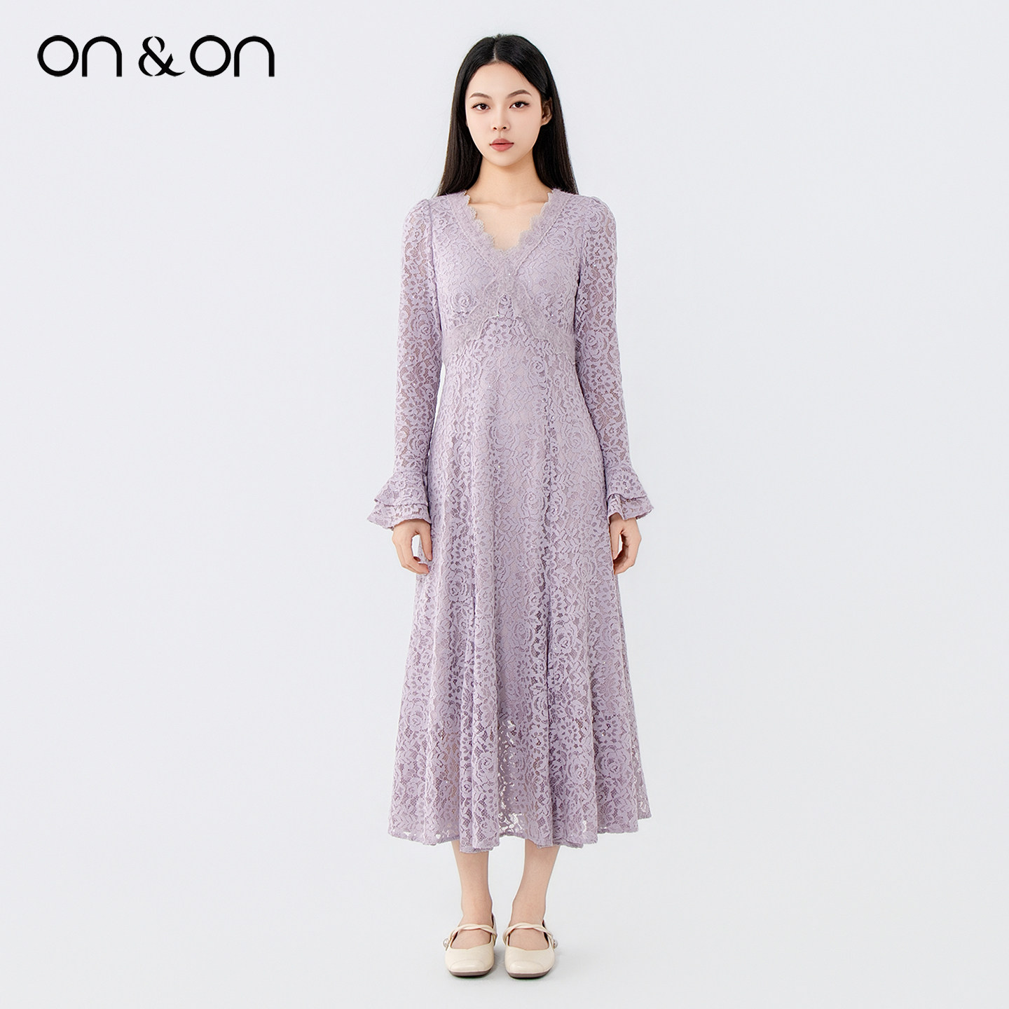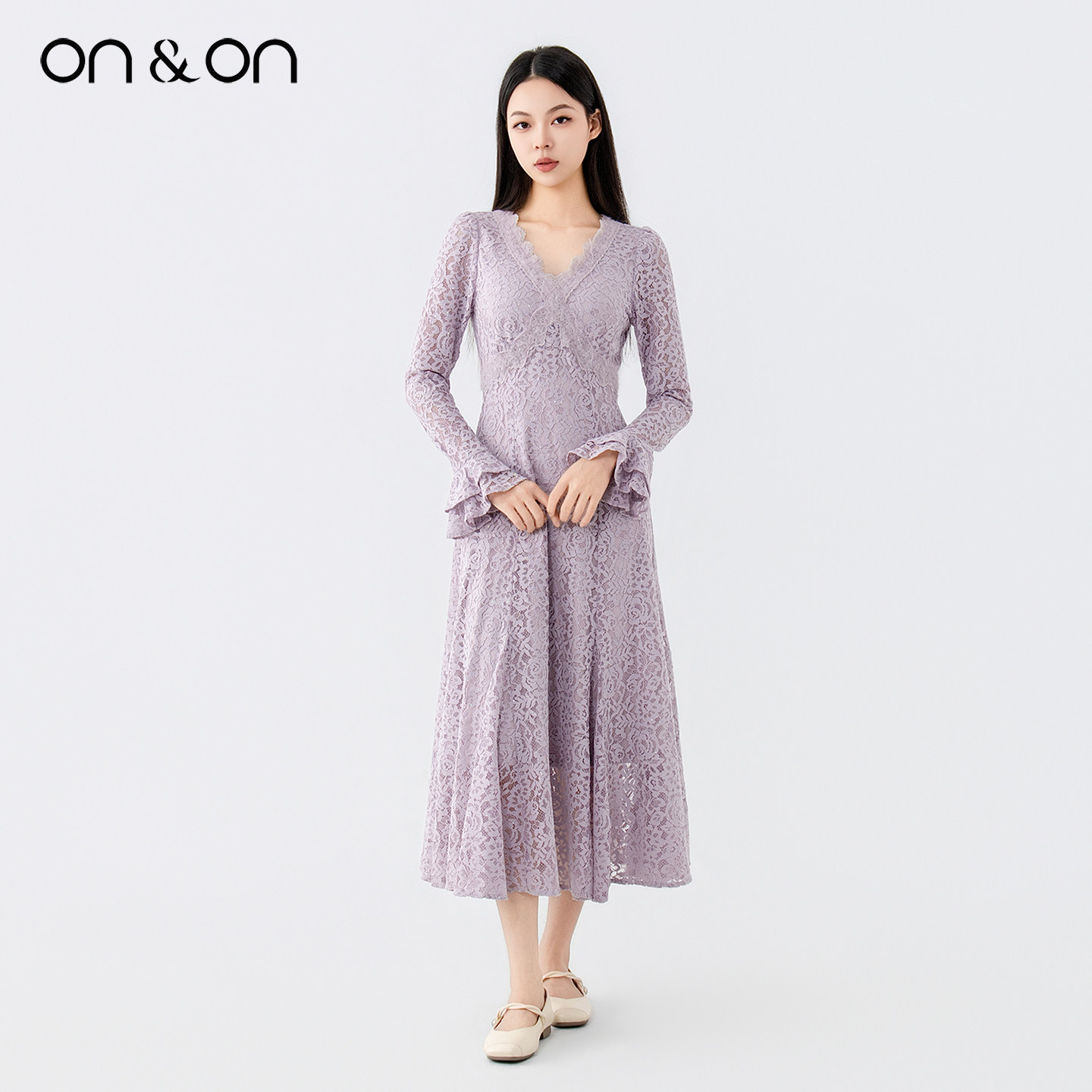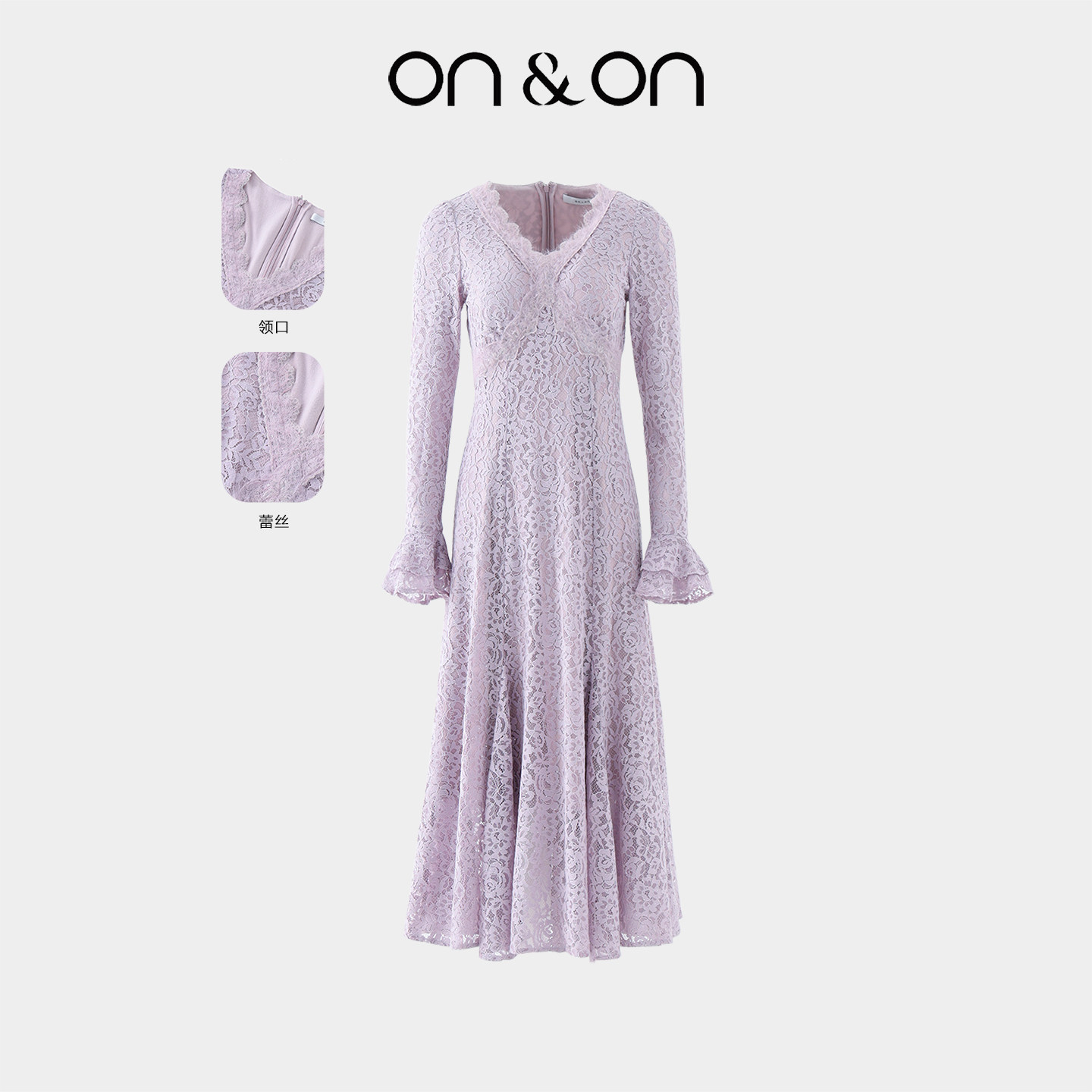 ON&ON/安乃安2025冬季新款韩系V领浪漫修身保暖植绒蕾丝连衣裙女
