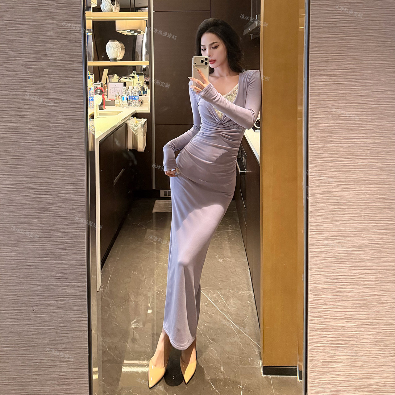 冰冰私服 V领亮片褶皱修身显瘦高级长袖连衣裙气质优雅女装