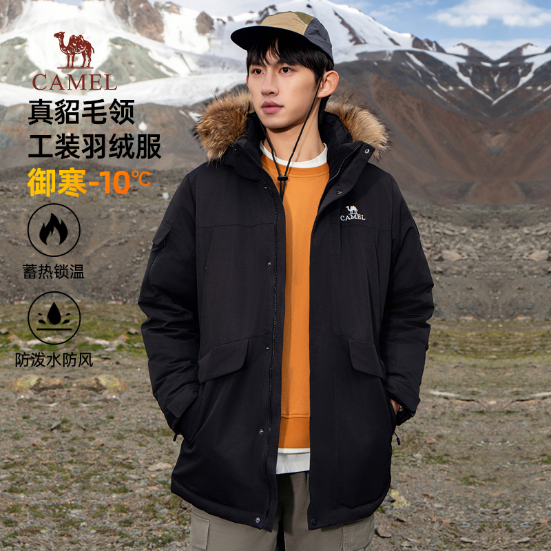骆驼男装毛领羽绒服男冬季加厚工装情侣款防水极寒中长款外套男