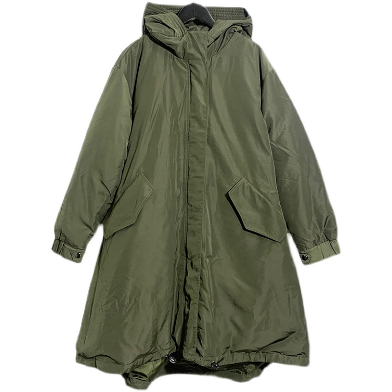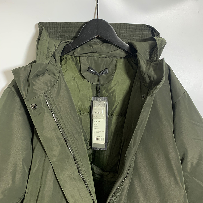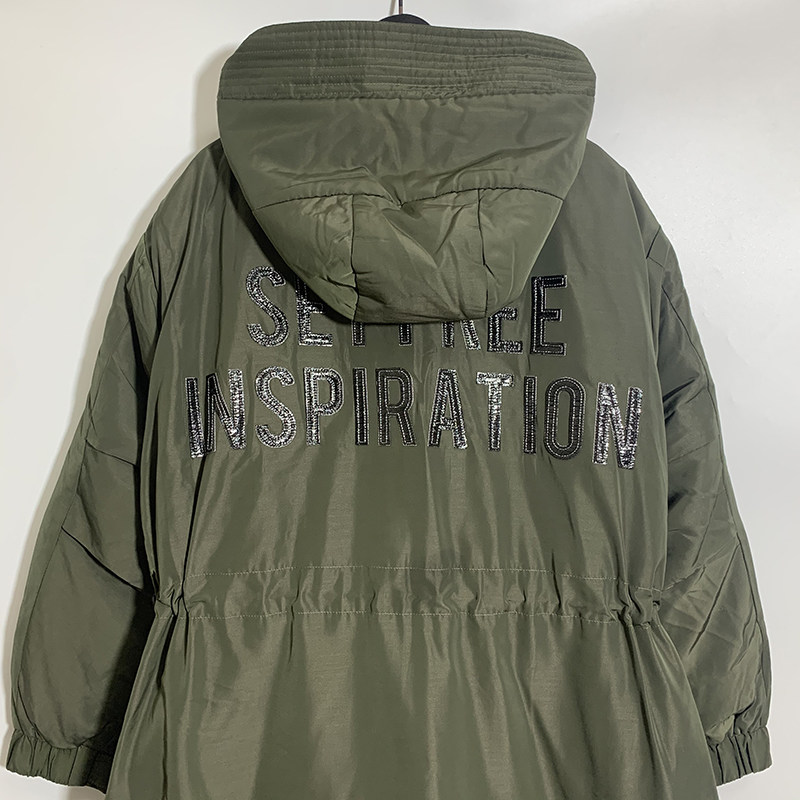 圣迪家女式字母贴布A字版连帽工装防风中长款斗篷羽绒服2416