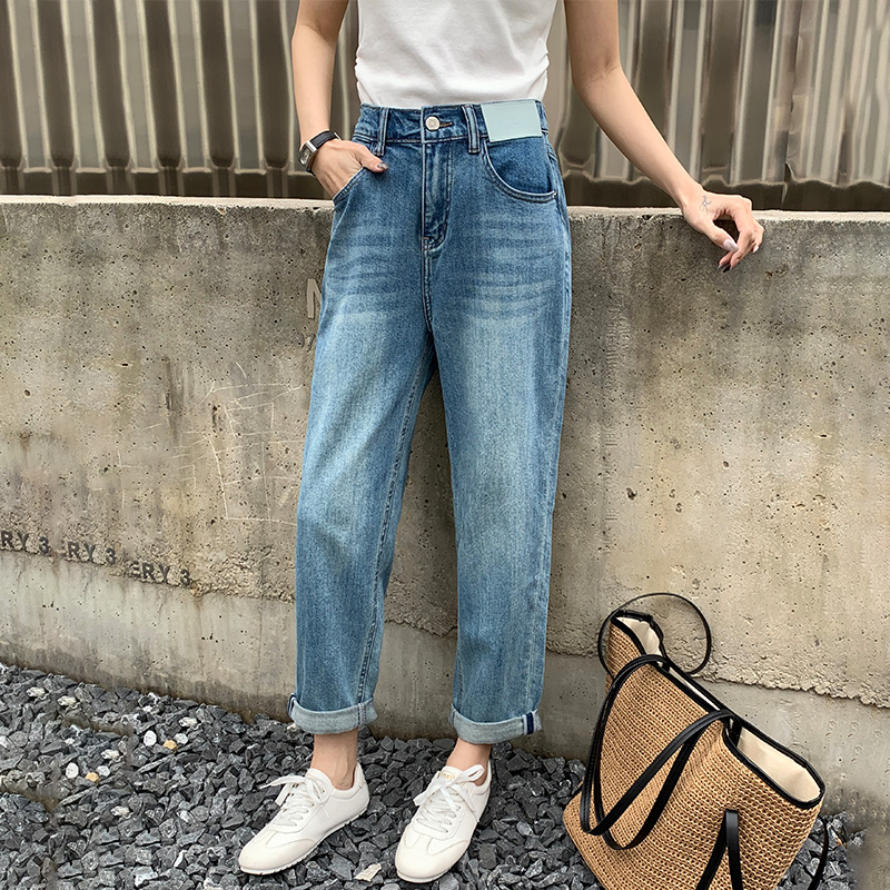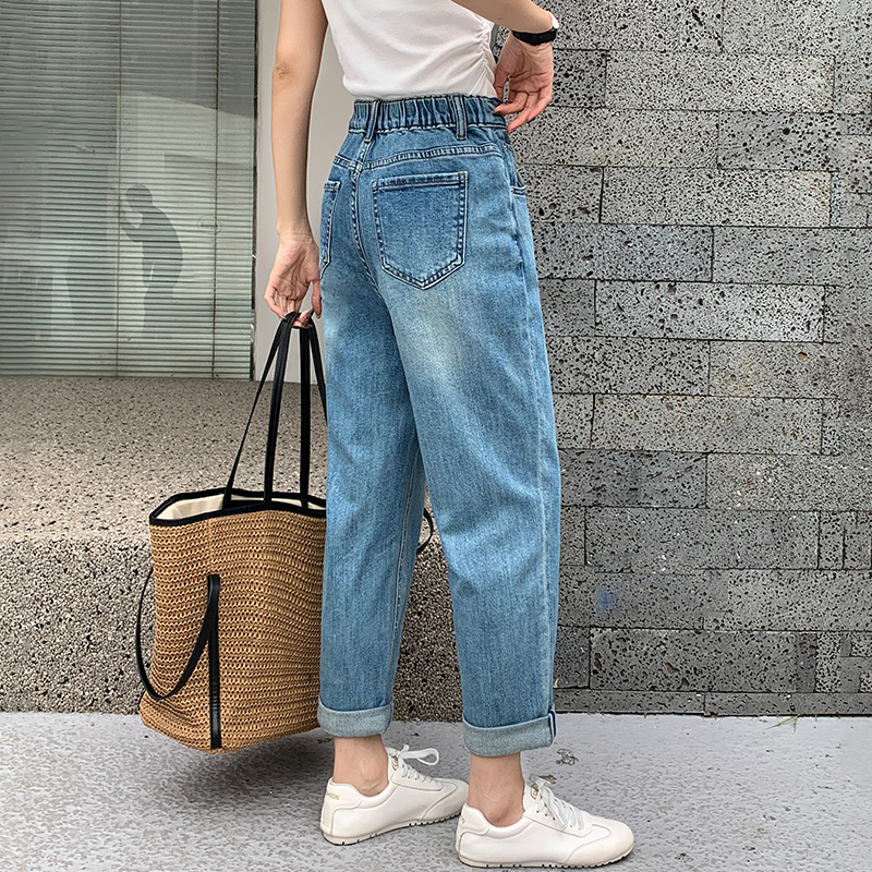 夏季后松紧腰九分女牛仔老爹跨裤