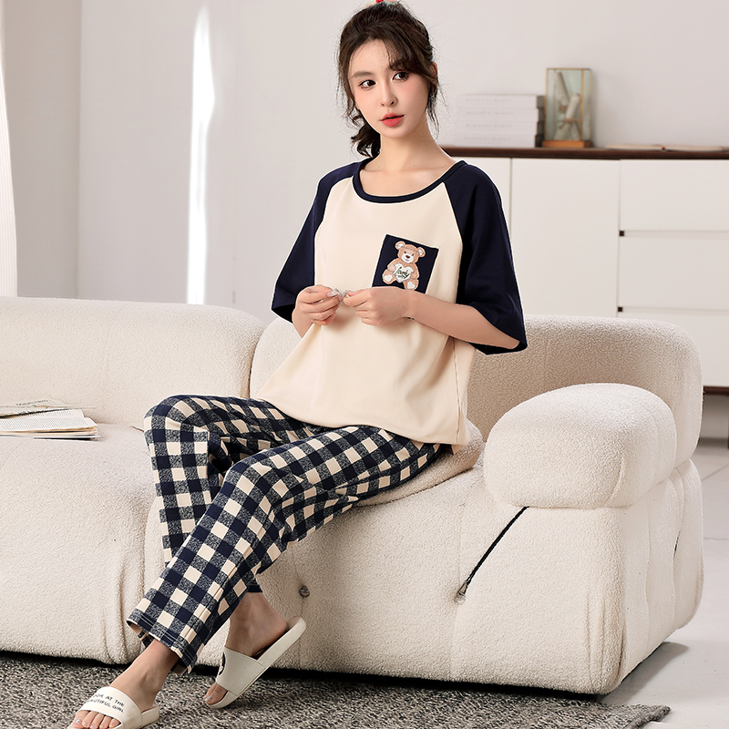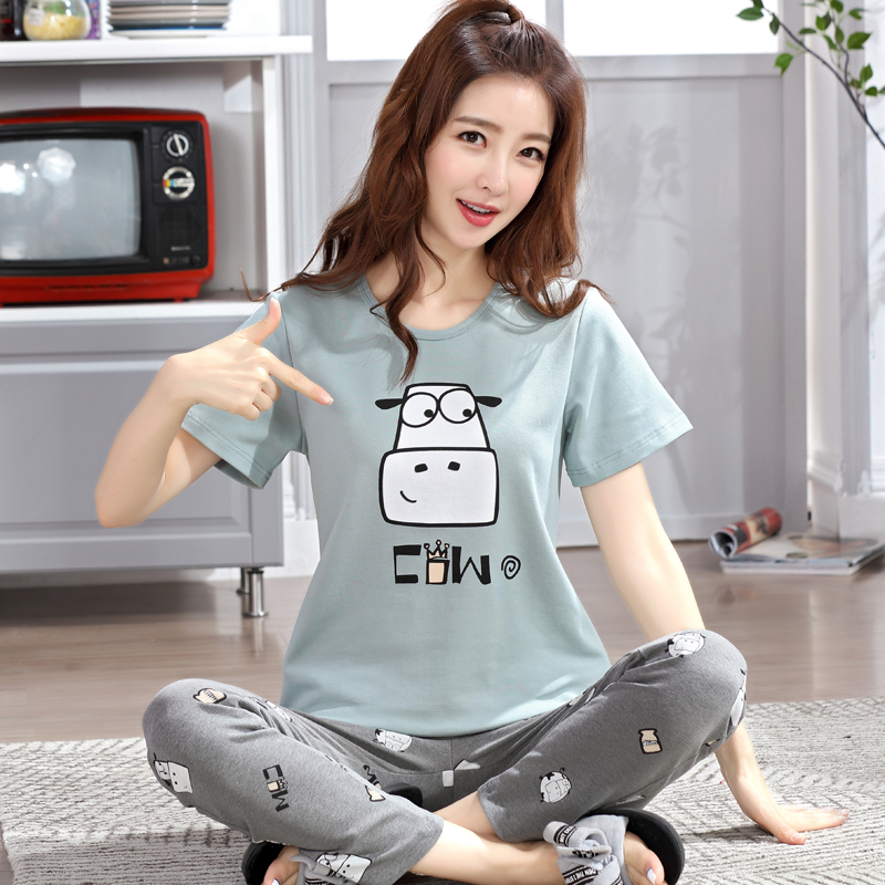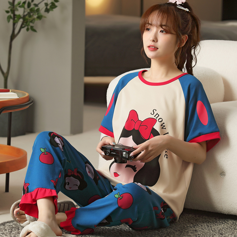 女士睡衣春秋季纯棉短袖长裤卡通女孩学生大码宽松夏天薄款家居服