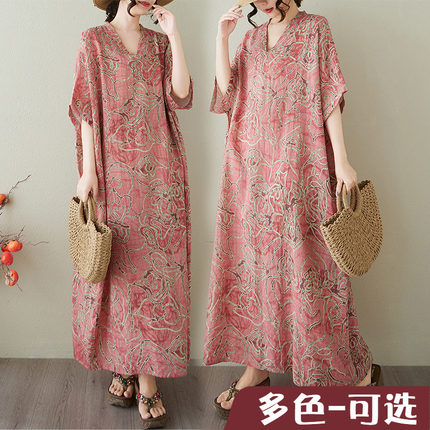 过膝脚裹长裙夏季花色度假风旅游V领复古长裙遮肉棉麻连衣裙粉色