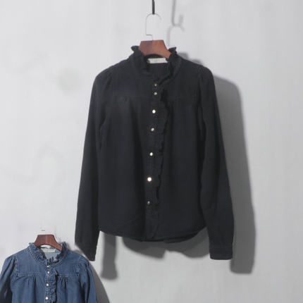 黑色门襟荷叶边牛仔衬衫春秋女装批新款发长袖减龄显瘦打底衬衣