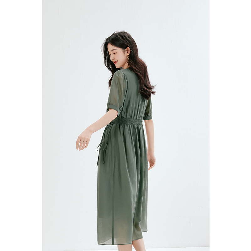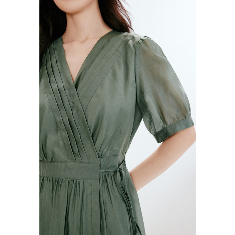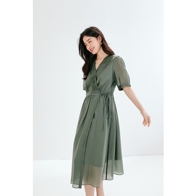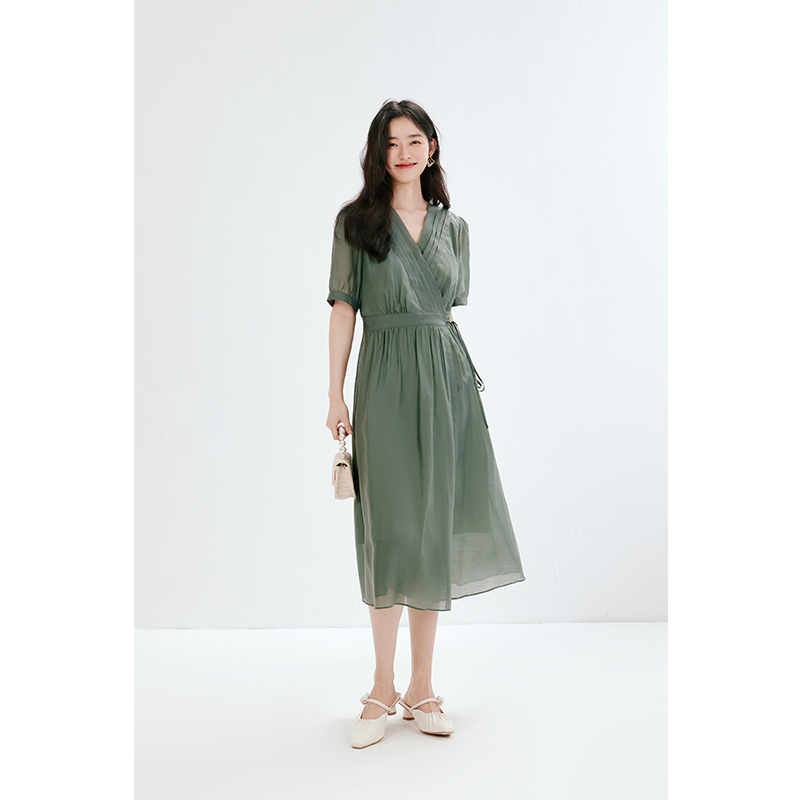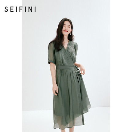 诗凡黎v领薄荷曼波莱赛尔连衣裙春夏系带中长裙女伊芙丽outlets店