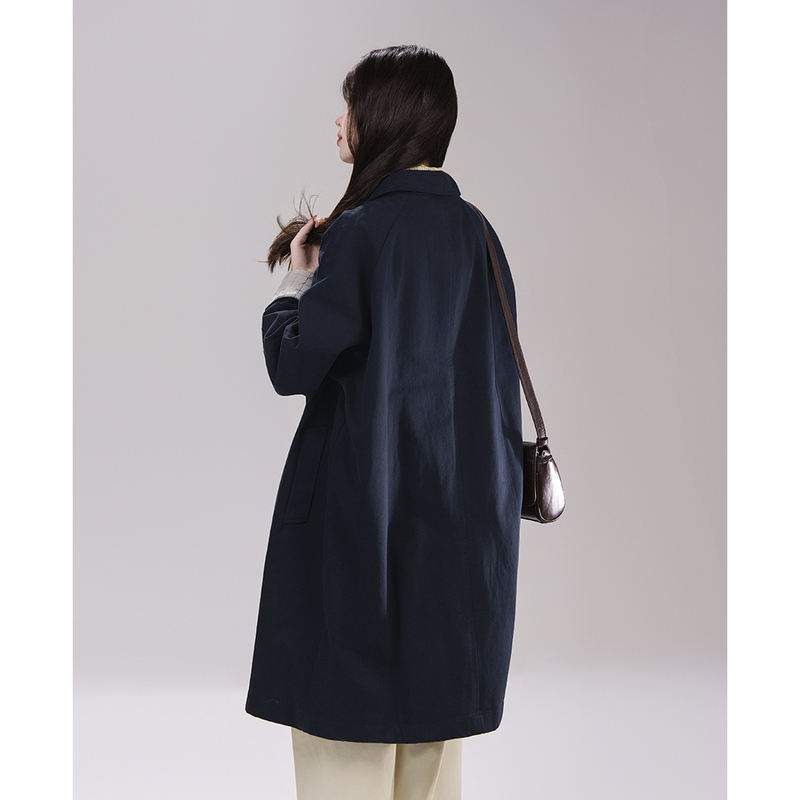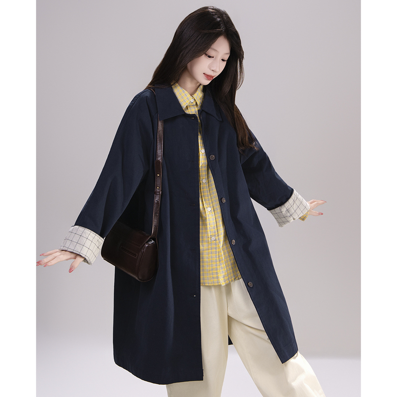 艺野系日系藏青色格纹袖口中长款风衣女秋小个子宽松慵懒大衣外套