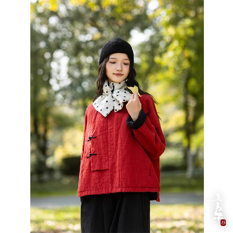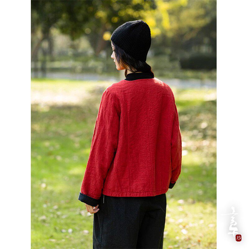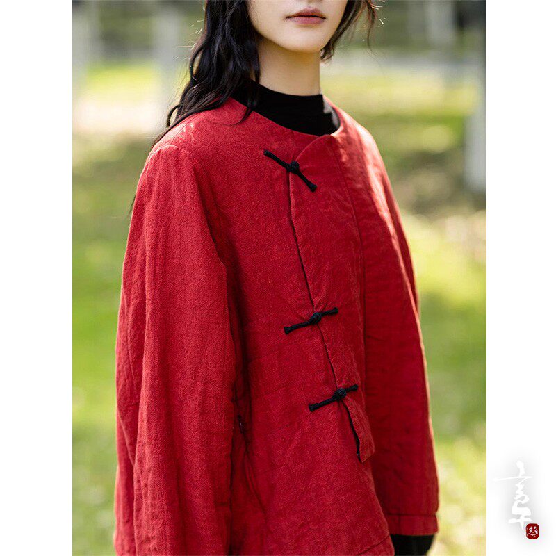 言午葵冬色织亚麻中式盘扣斜襟小众特色红色棉服3M新雪丽保暖棉衣