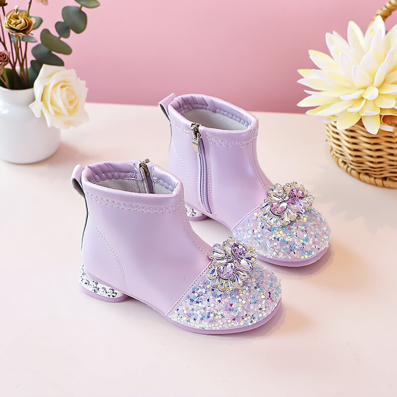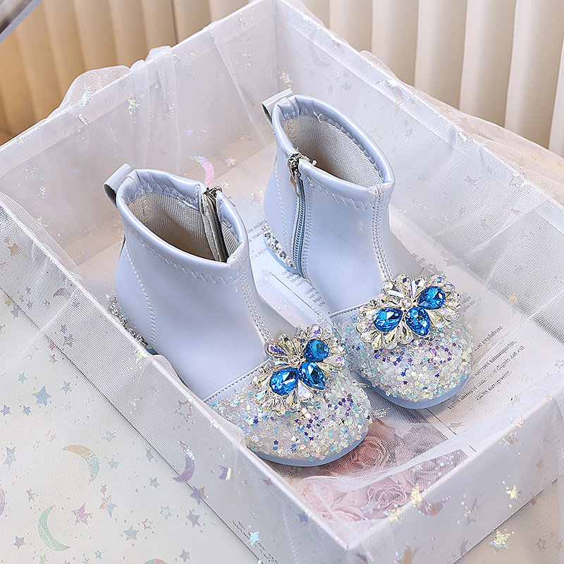 女童鞋子水钻公主鞋中大童短靴2025冬鞋亮片鞋女孩艾莎儿童水晶鞋