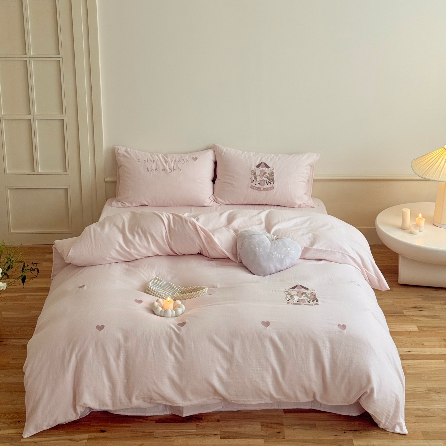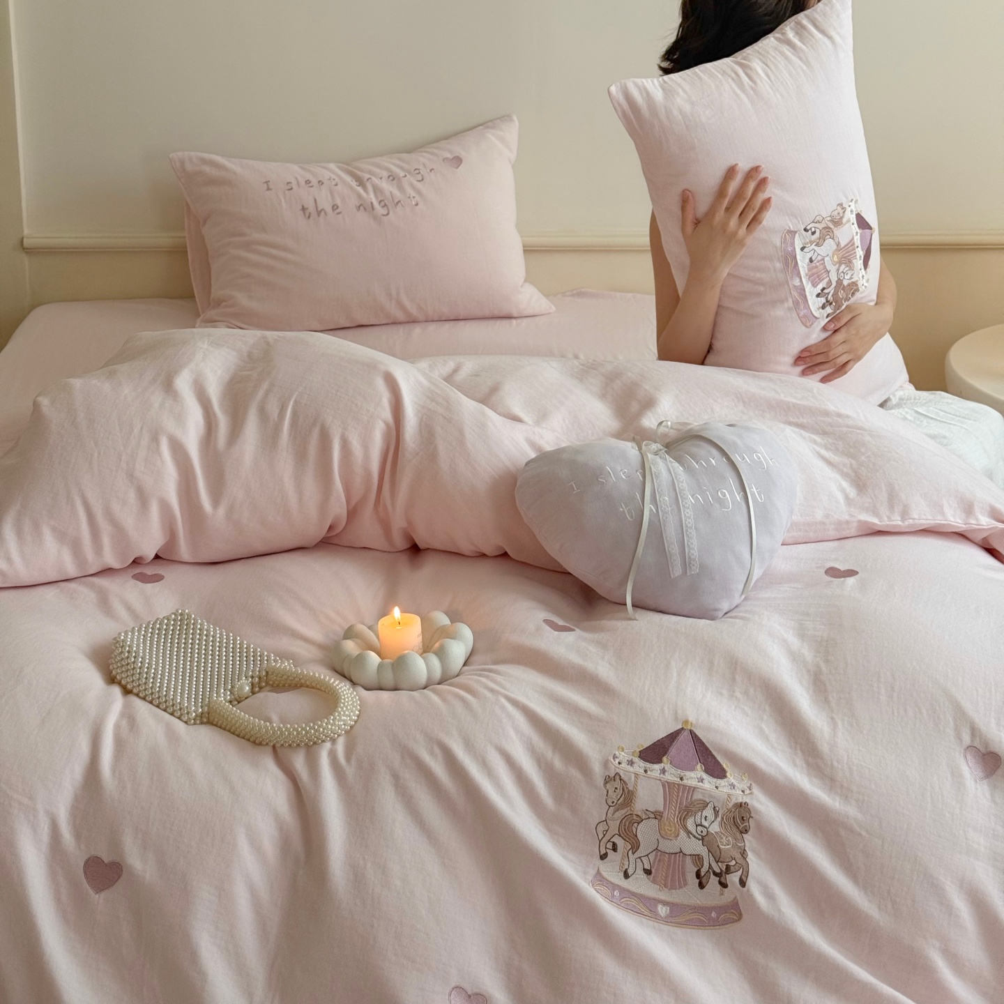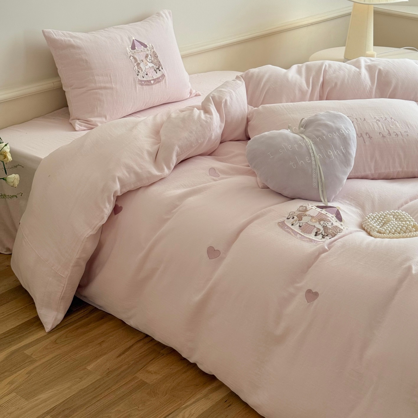 红花车全棉皱皱纱四件套旋转木马刺绣女孩床上用品被套床单套件