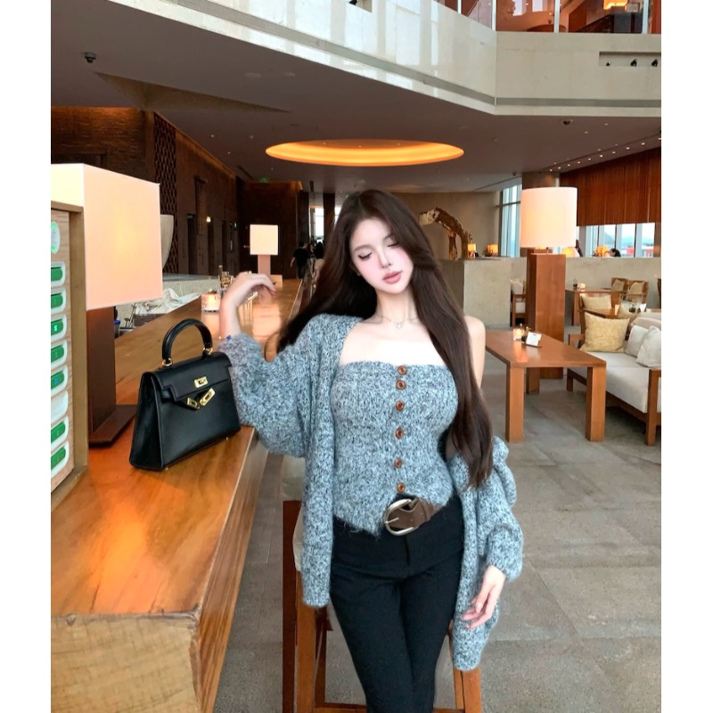慵懒风纯欲软糯短款针织抹胸开衫套装女秋冬性感显瘦灰色毛衣外套