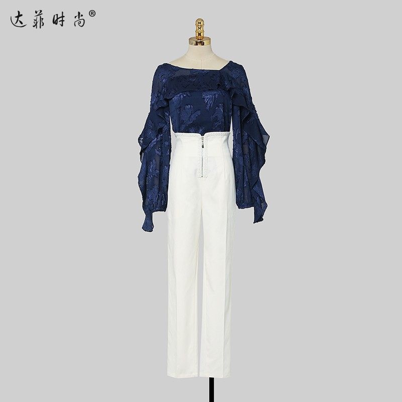 2025秋季新款时尚名媛雪纺提花荷叶边上衣高腰显瘦铅笔裤长裤套装