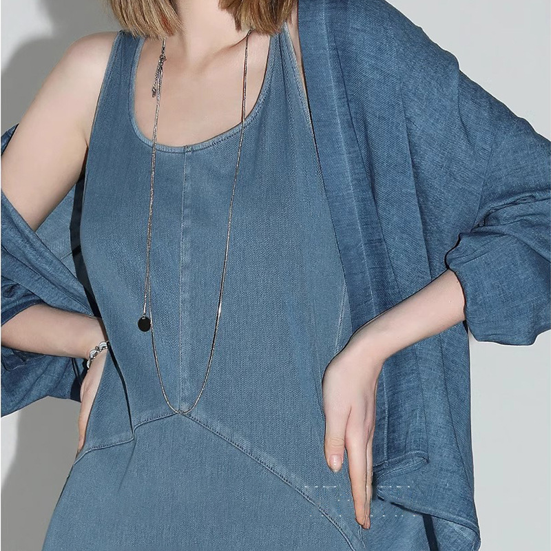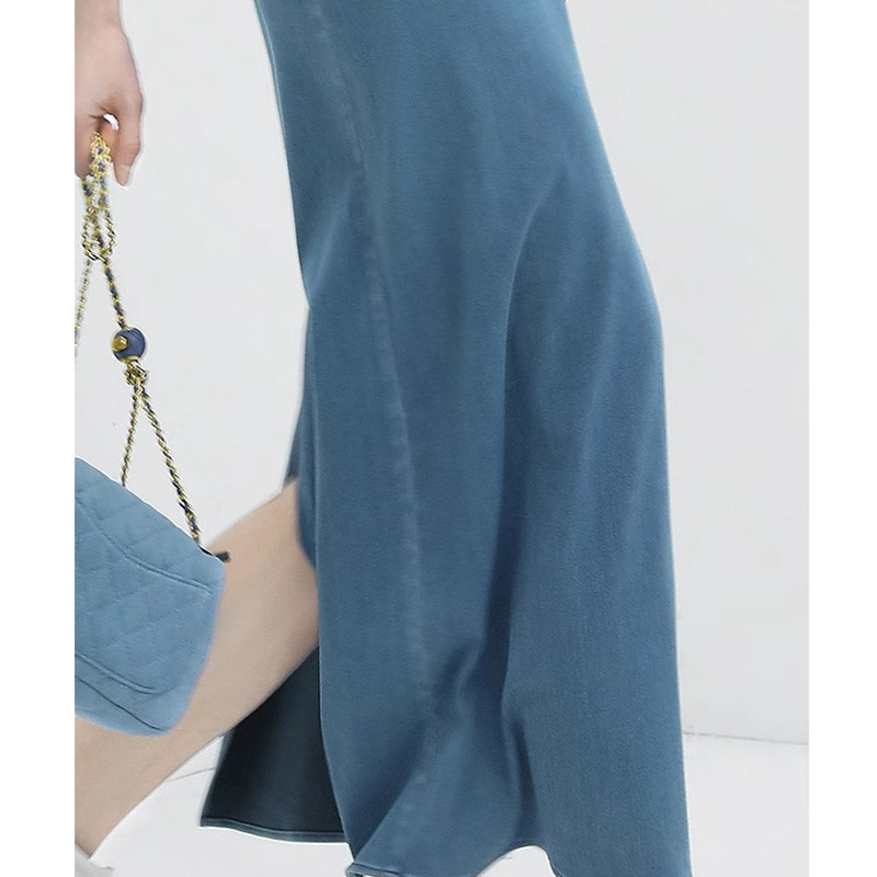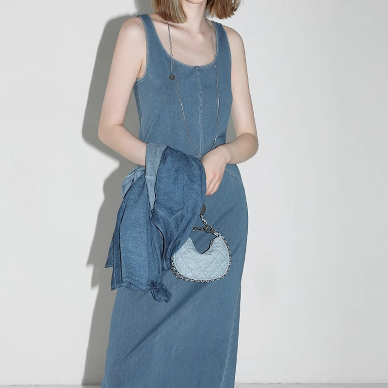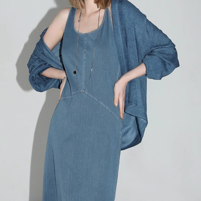 复古弹力针织连衣裙2025夏季简约休闲牛仔背带裙修身包臀通勤