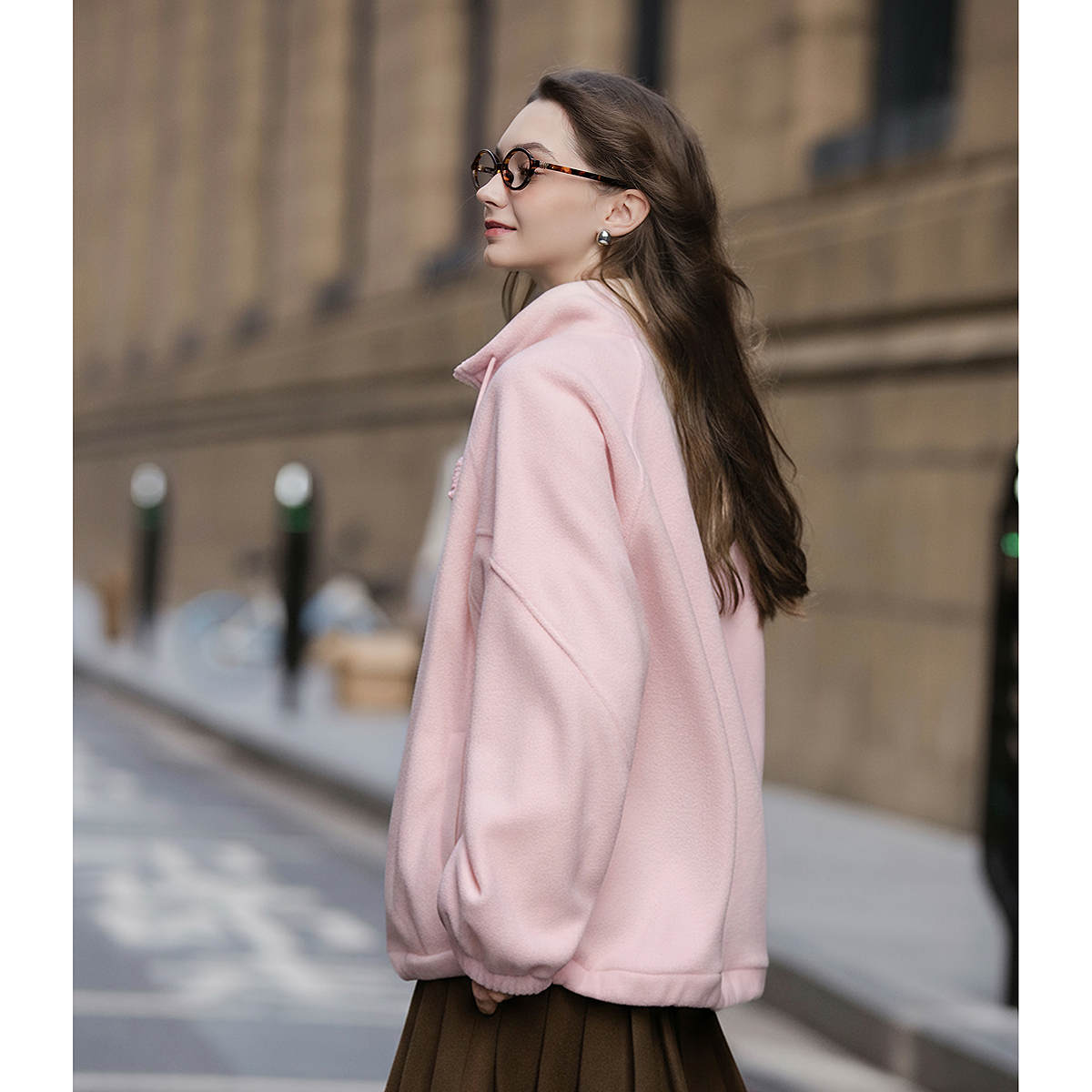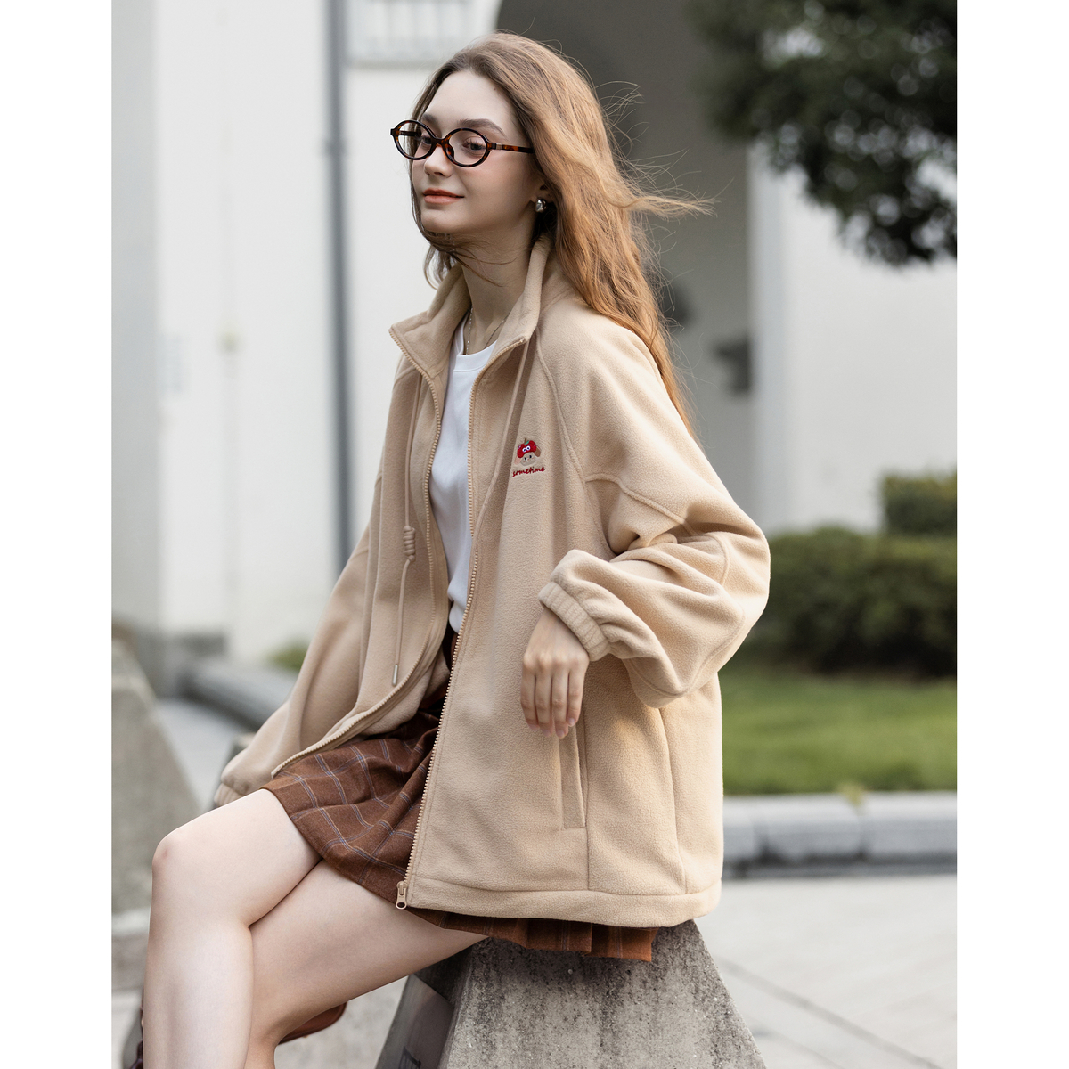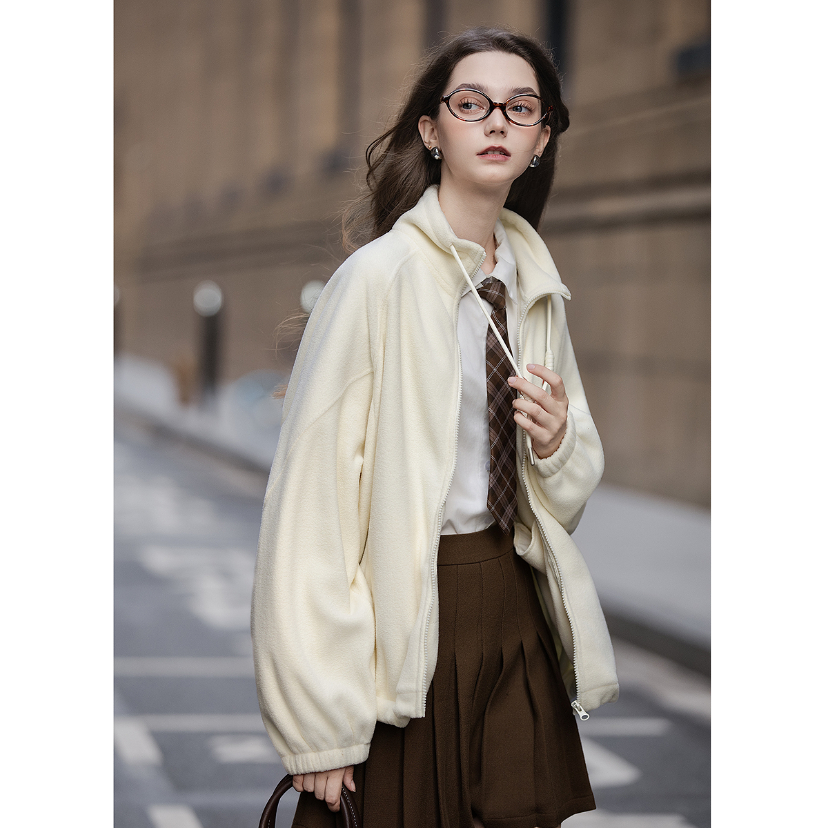 唐狮2025秋冬季短款外套摇粒绒女士厚立领米白色宽松休闲风百搭