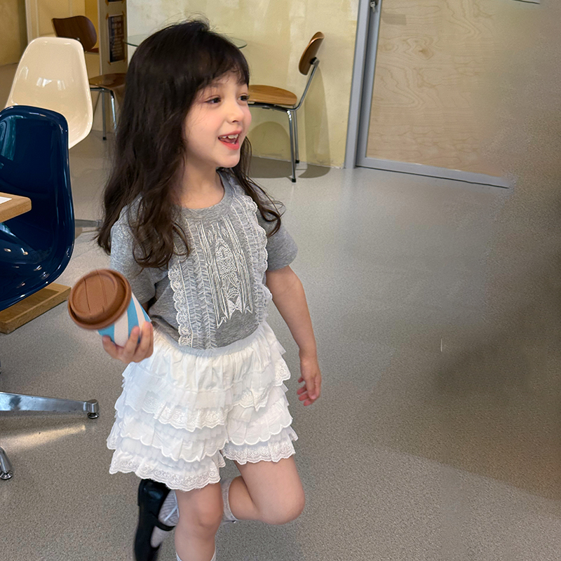 Yumi妈 女童洋气精致蕾丝拼接T恤上衣儿童甜美芭蕾风短袖 25D067
