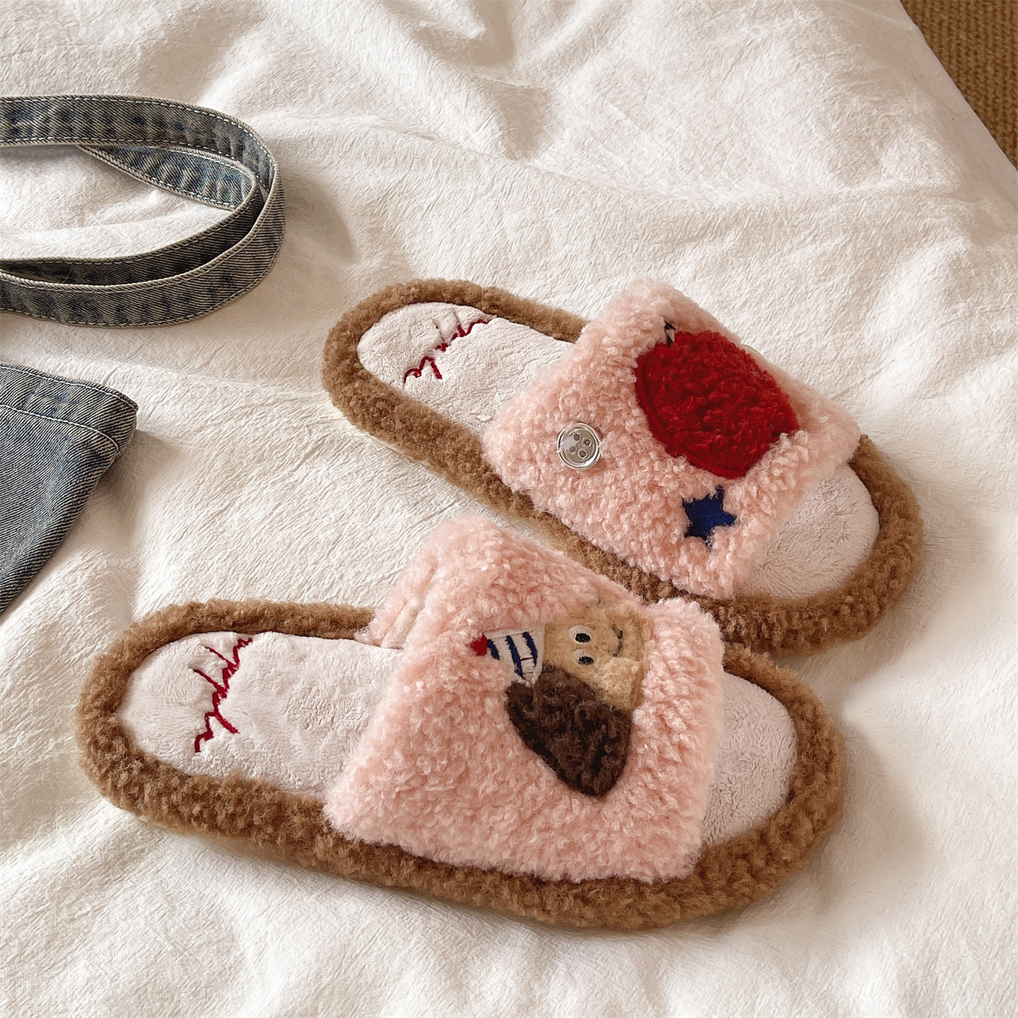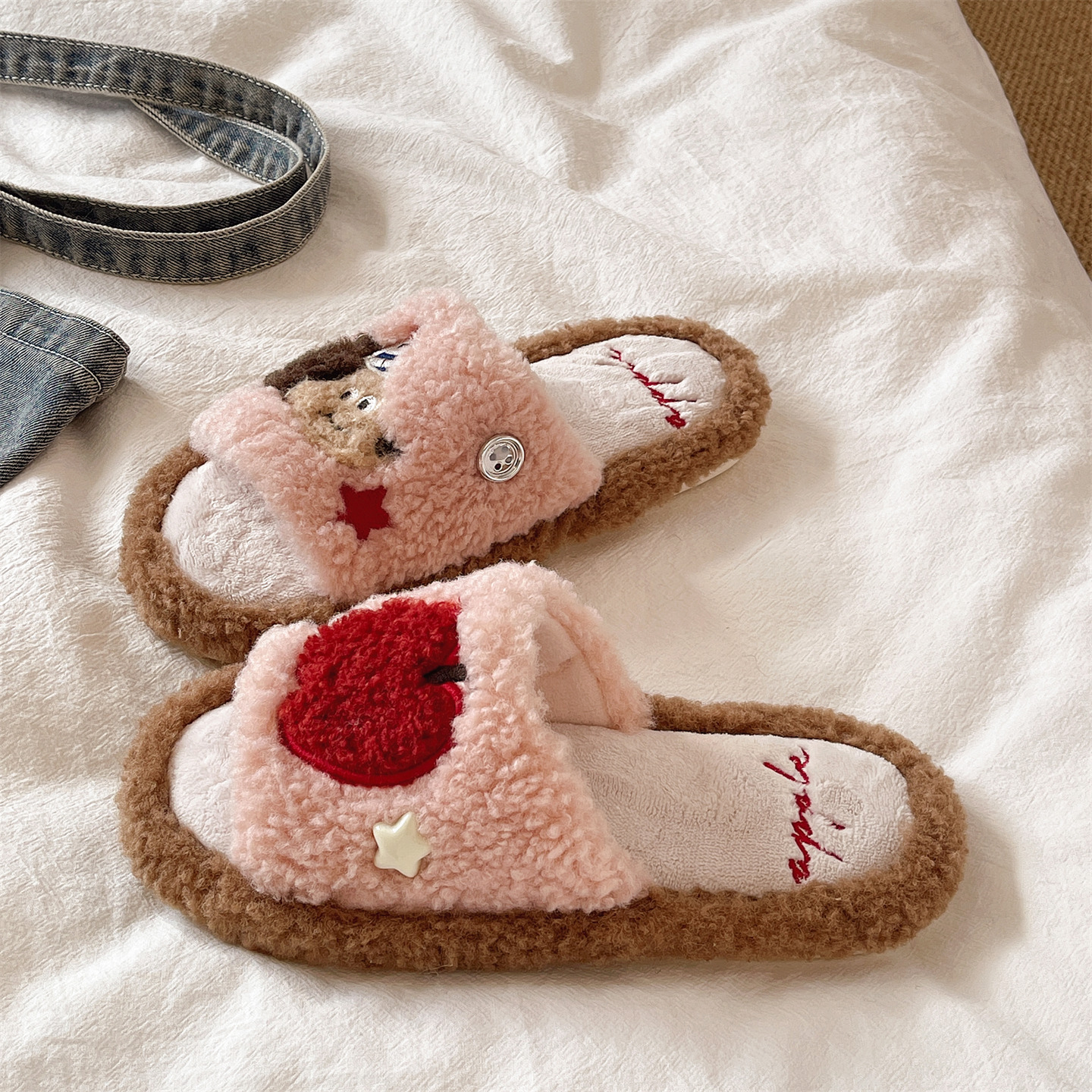 毛毛拖鞋女冬季可爱苹果小狗室内居家防滑软底毛绒保暖包头棉拖鞋