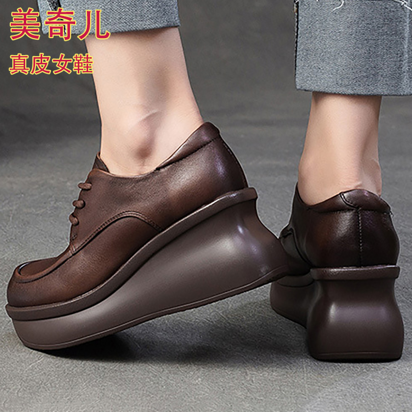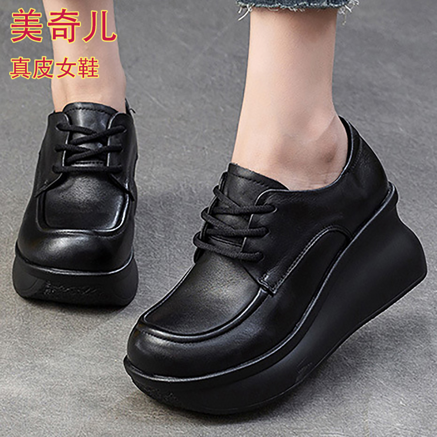 真牛皮坡跟厚底增高系带深口松糕鞋百搭洋气高跟鞋秋冬超仙女鞋