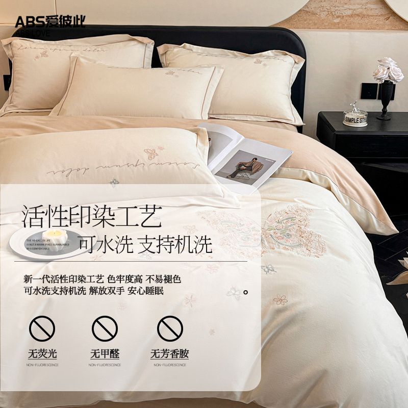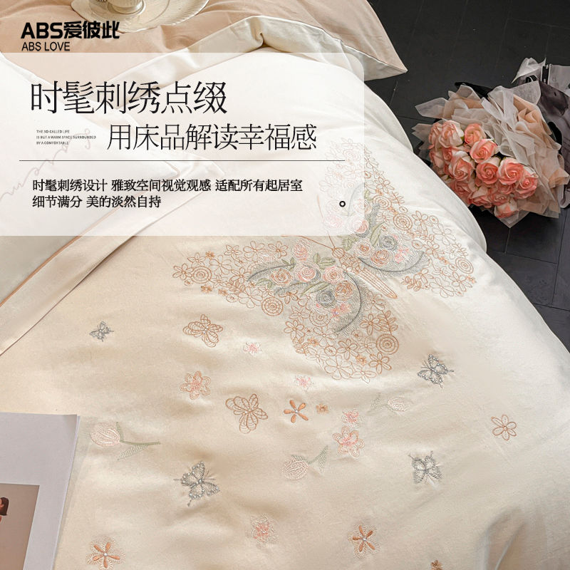 ABS爱彼此全棉磨毛四件套纯棉轻奢刺绣被套床上用品四季通用床笠