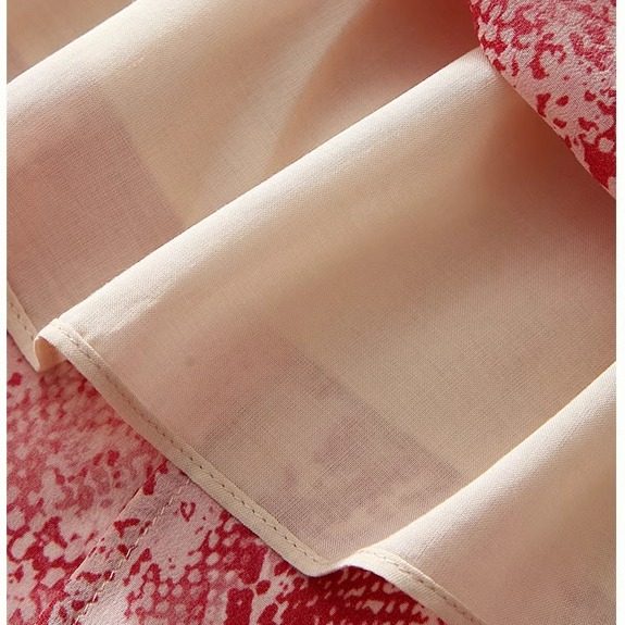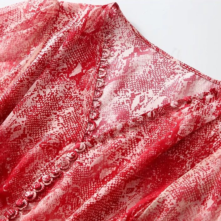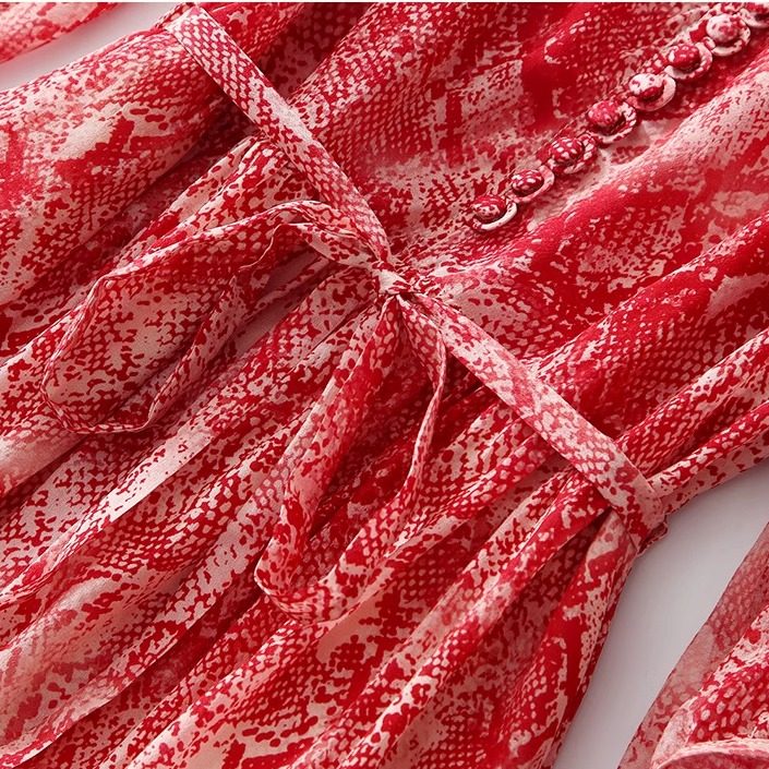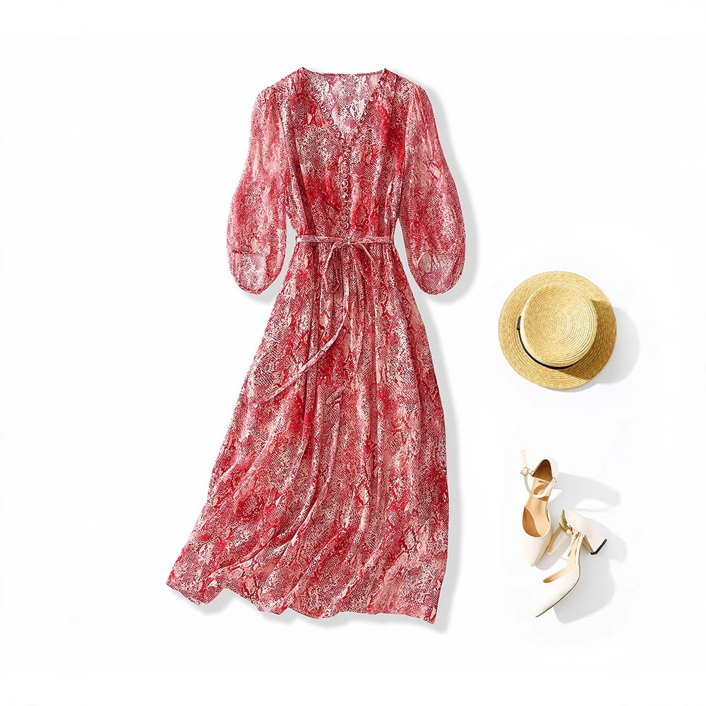 夏季时尚气质V领七分袖真丝印花系带中长款桑蚕丝荷叶边连衣裙女
