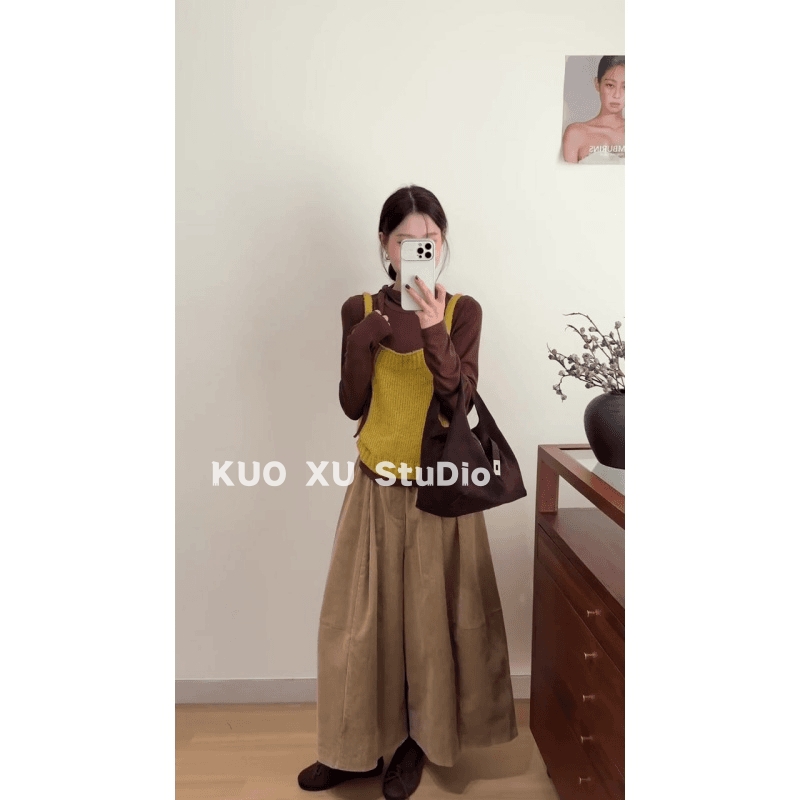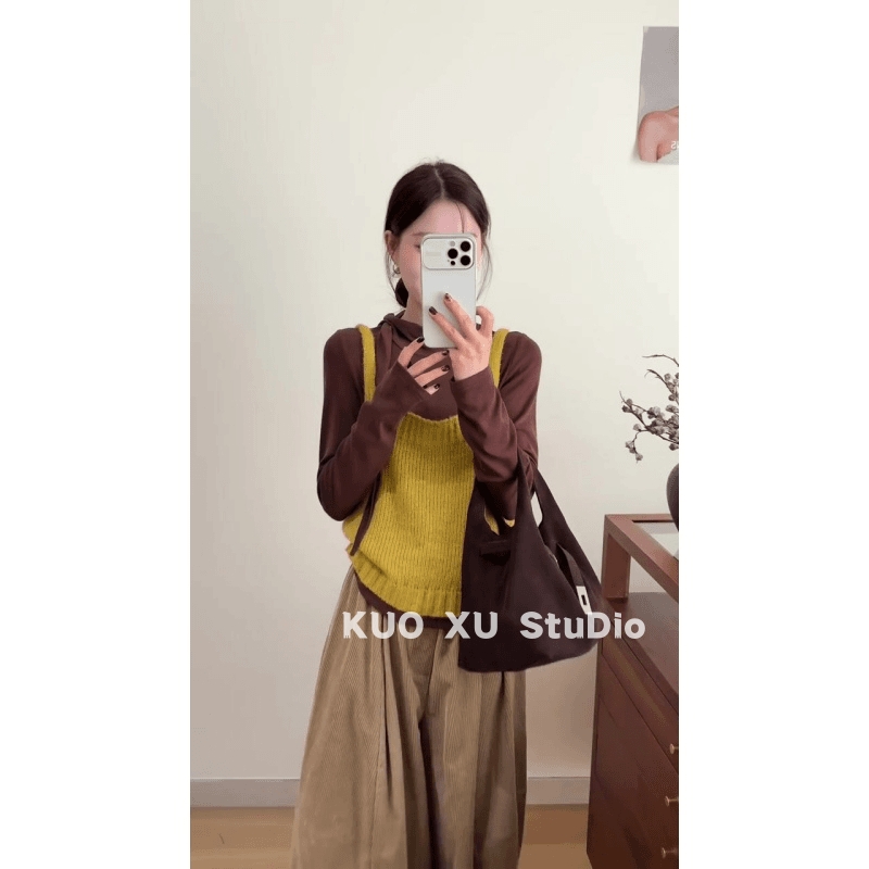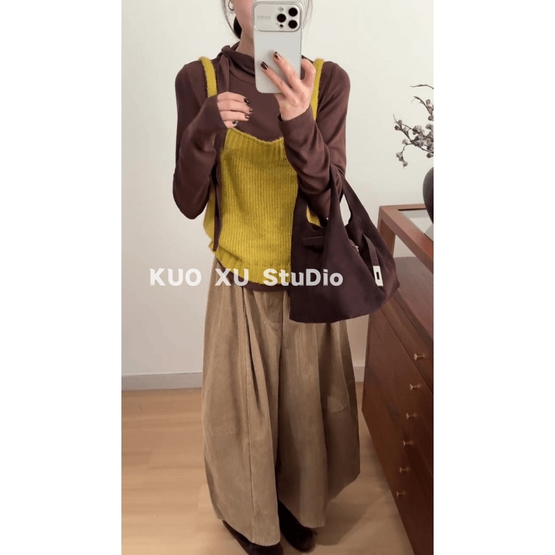 早秋穿搭复古感长袖打底衫叠穿针织背心马甲高腰宽松阔腿裤套装女