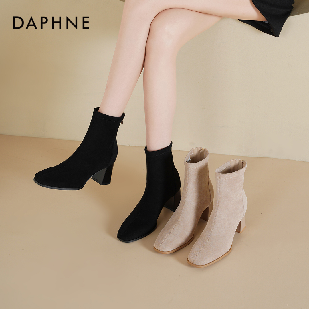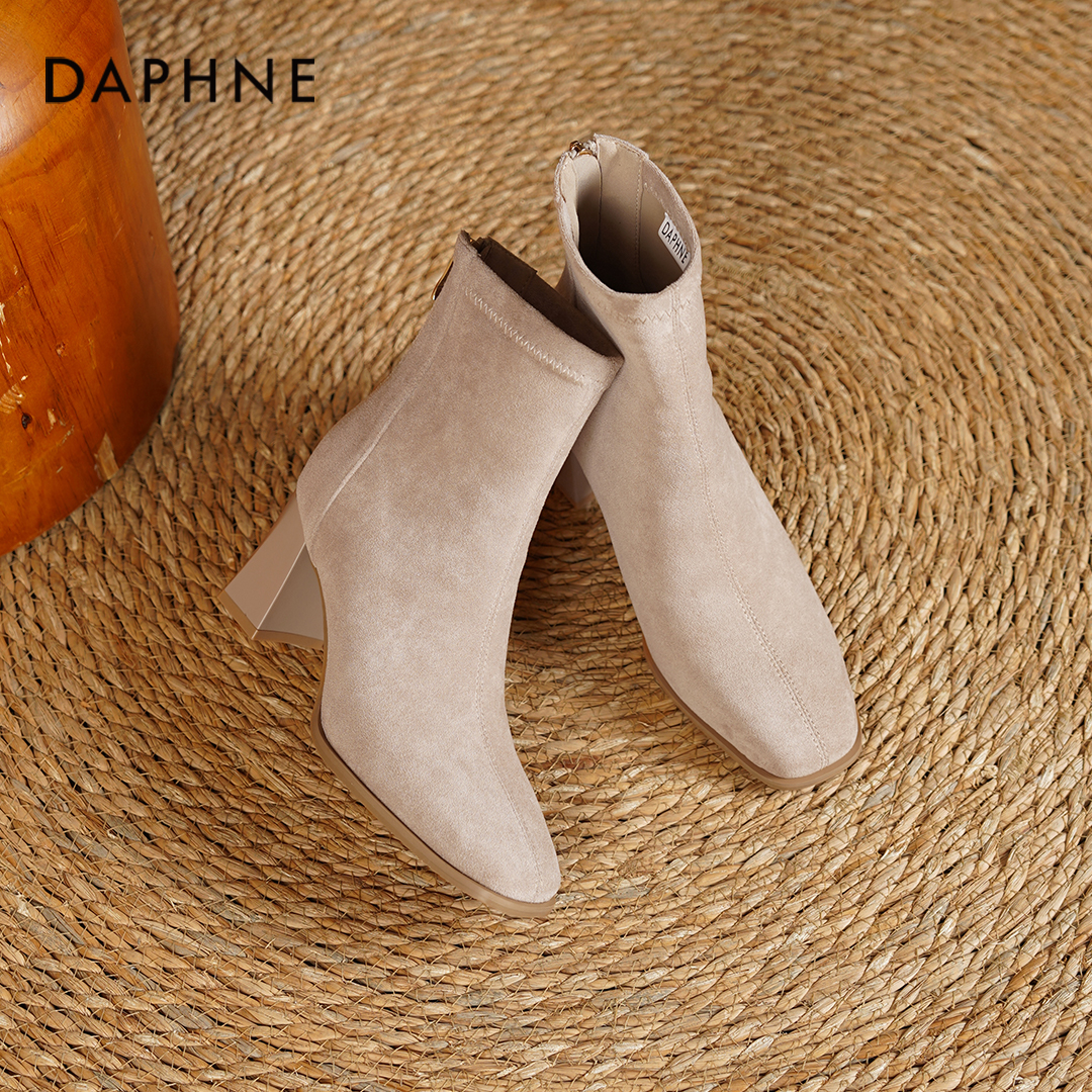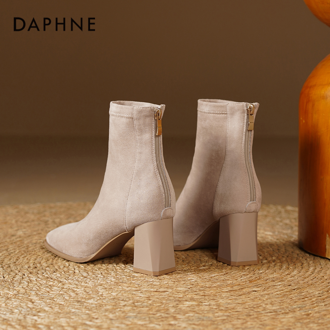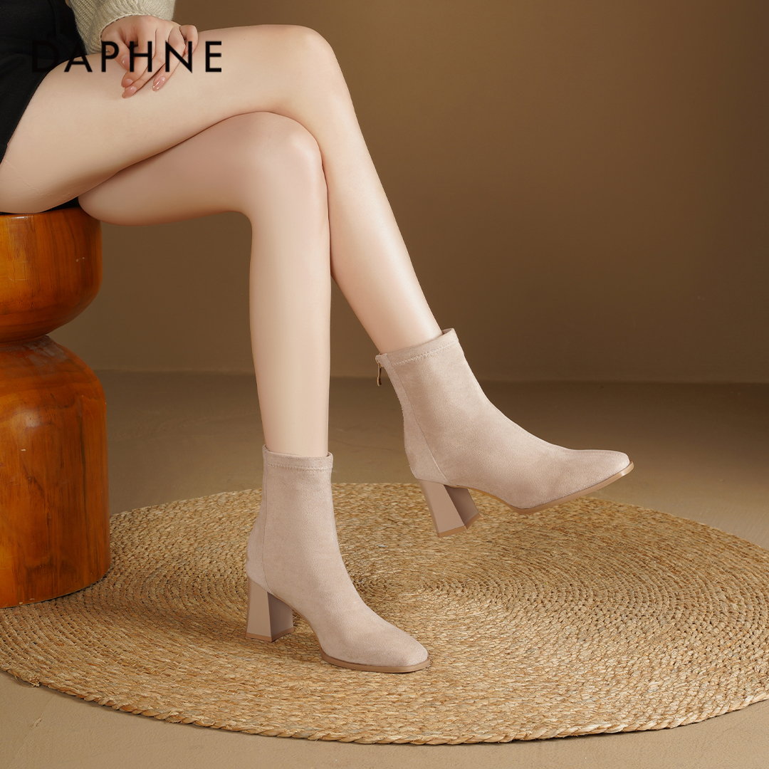 达芙妮高跟短靴女2025新款秋冬法式绒面通勤裸靴粗跟尖头瘦瘦靴子