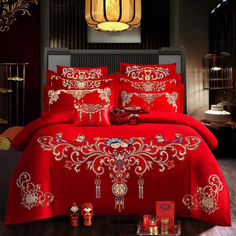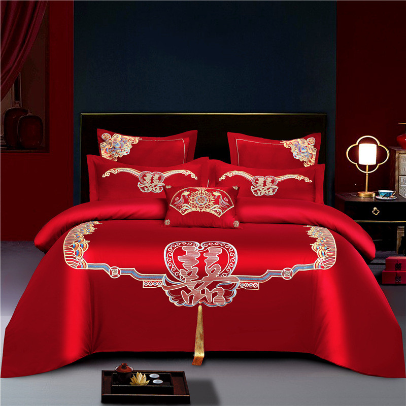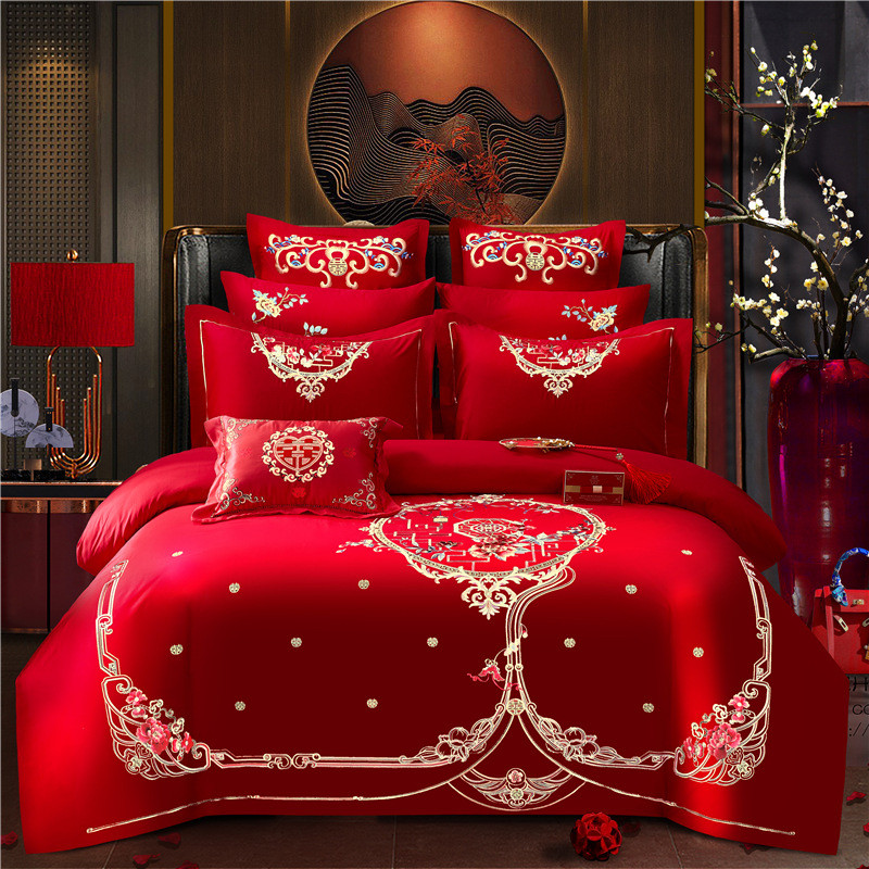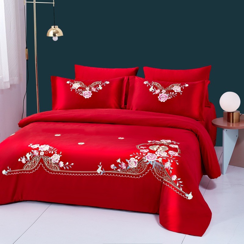 简约时尚婚庆四件套大红色亲肤棉刺绣被套床单笠结婚床上用品高档