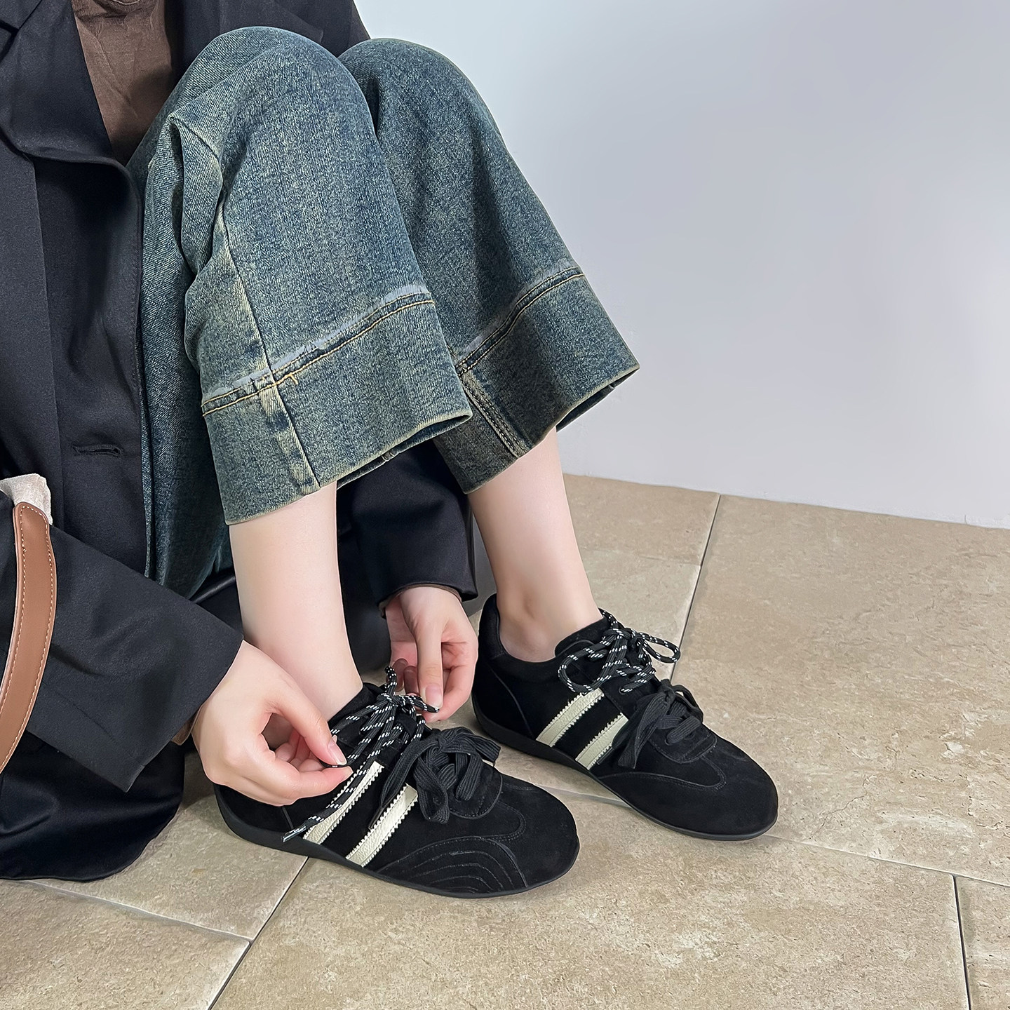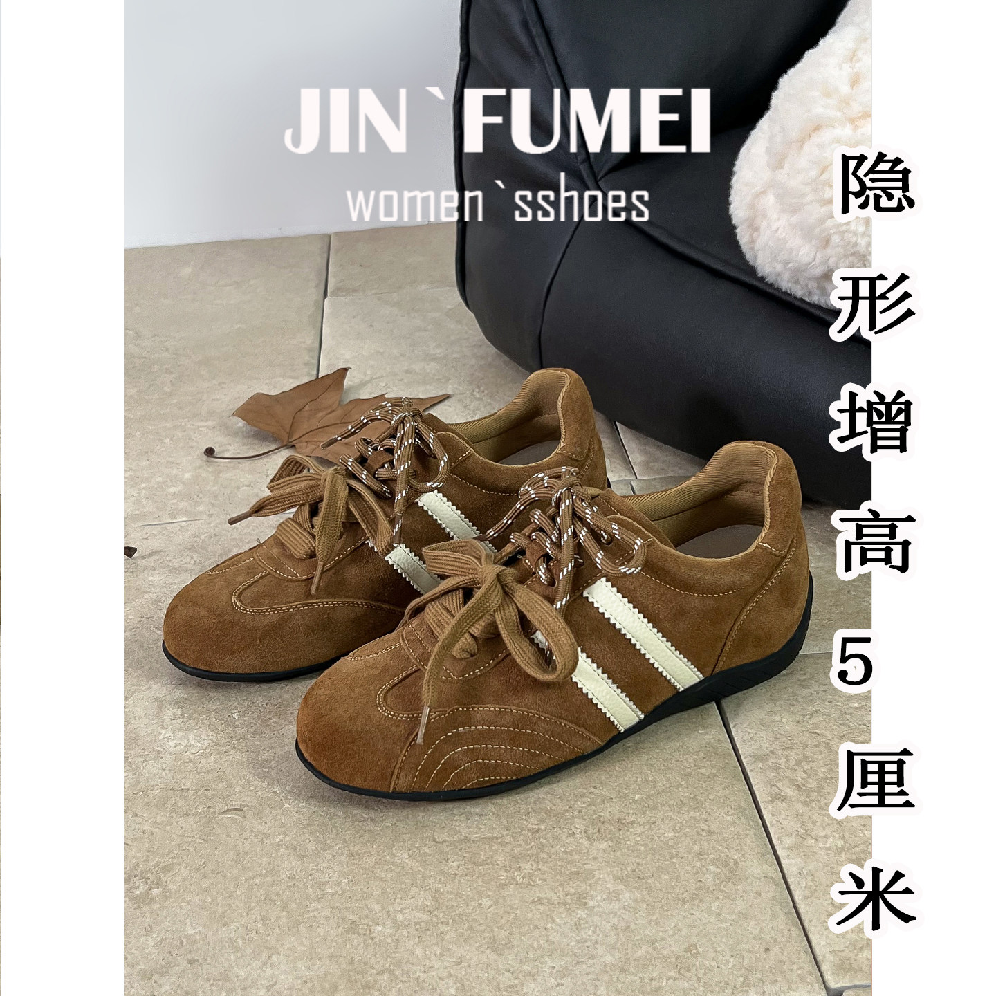 咖色真皮德训鞋女内增高5CM休闲鞋复古运动鞋秋冬加绒新款板鞋单