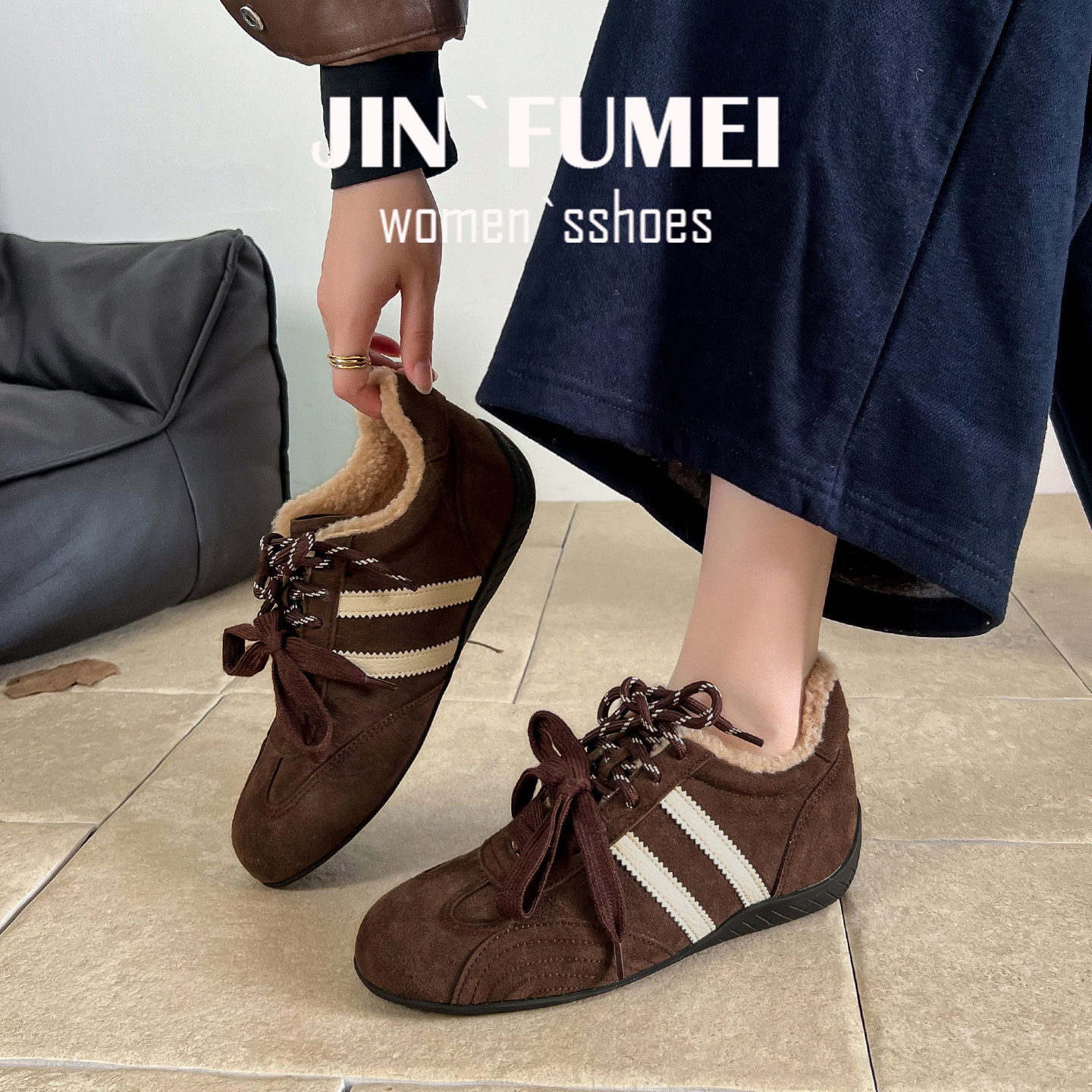 咖色真皮德训鞋女内增高秋冬加绒
