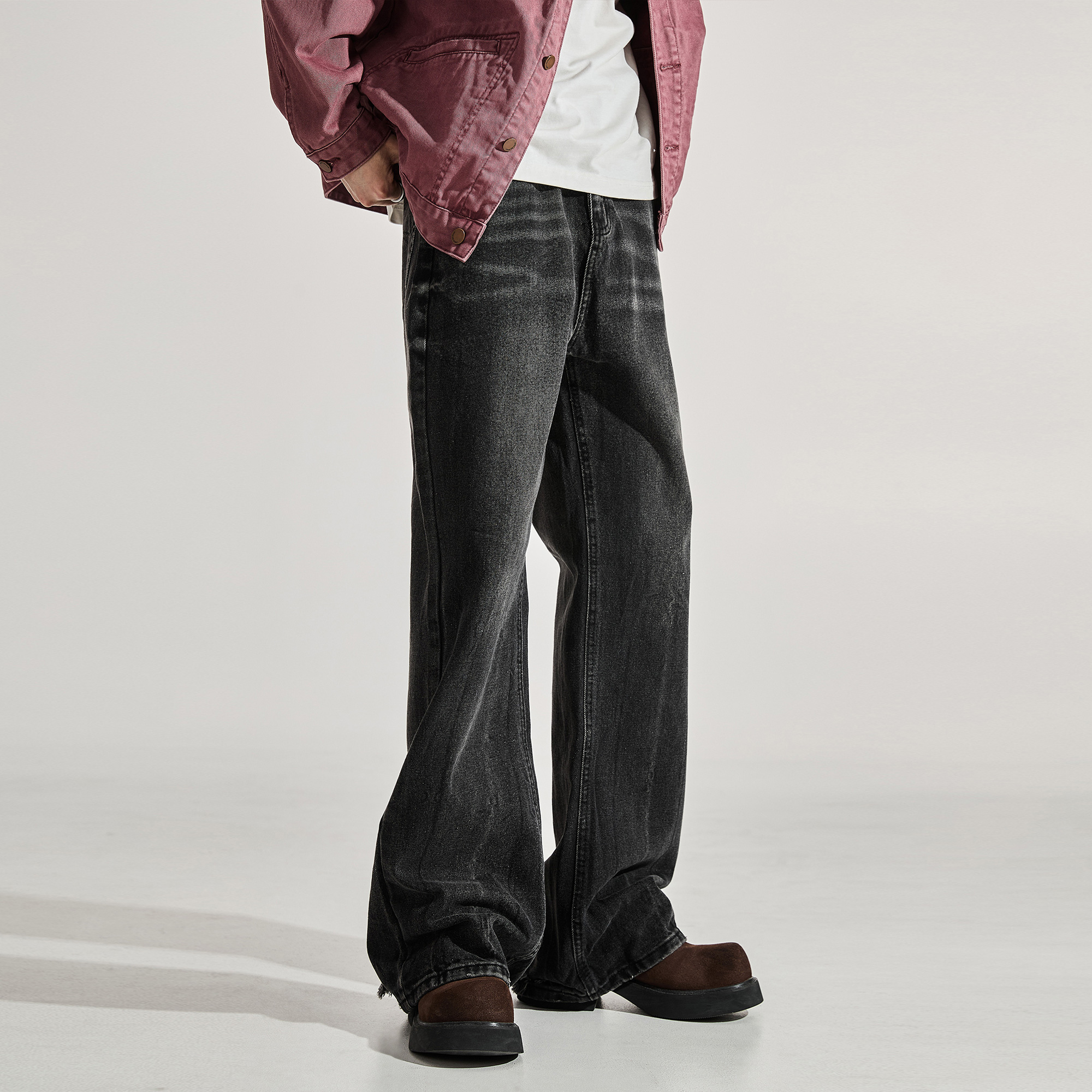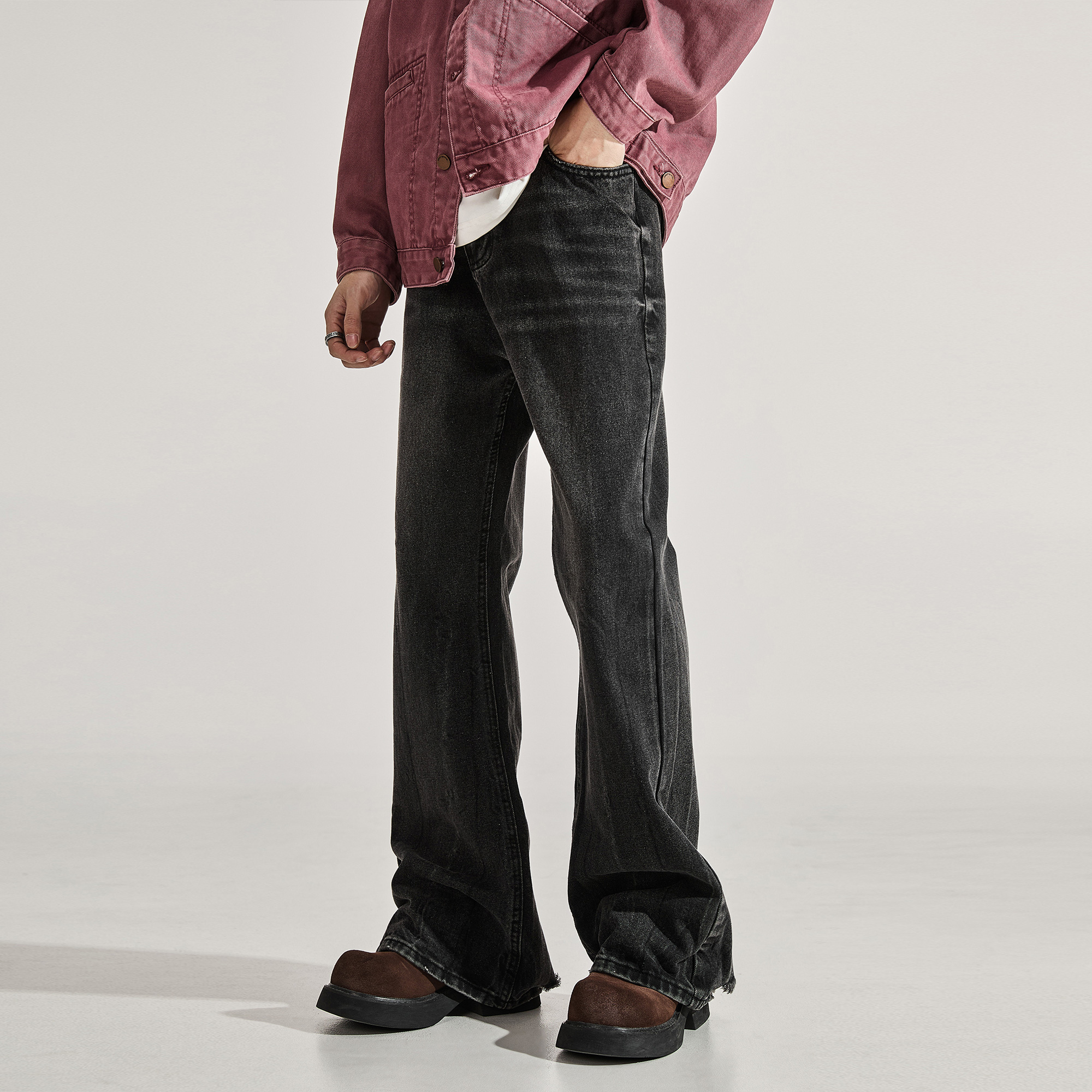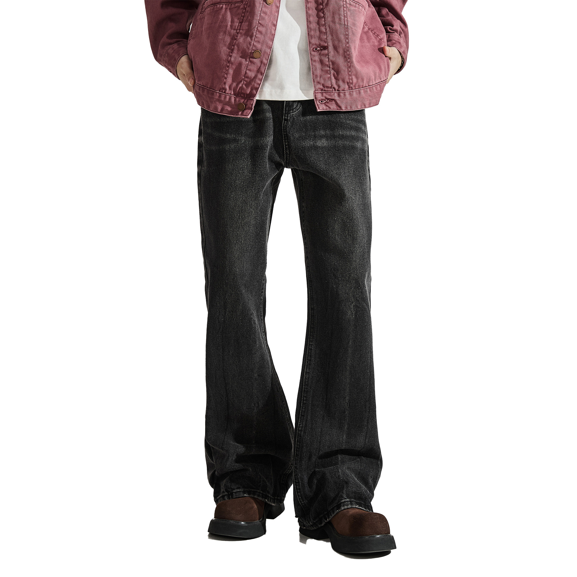 ALLIN 黑色窄版微喇牛仔裤男秋冬美式高街水洗修身直筒喇叭长裤子