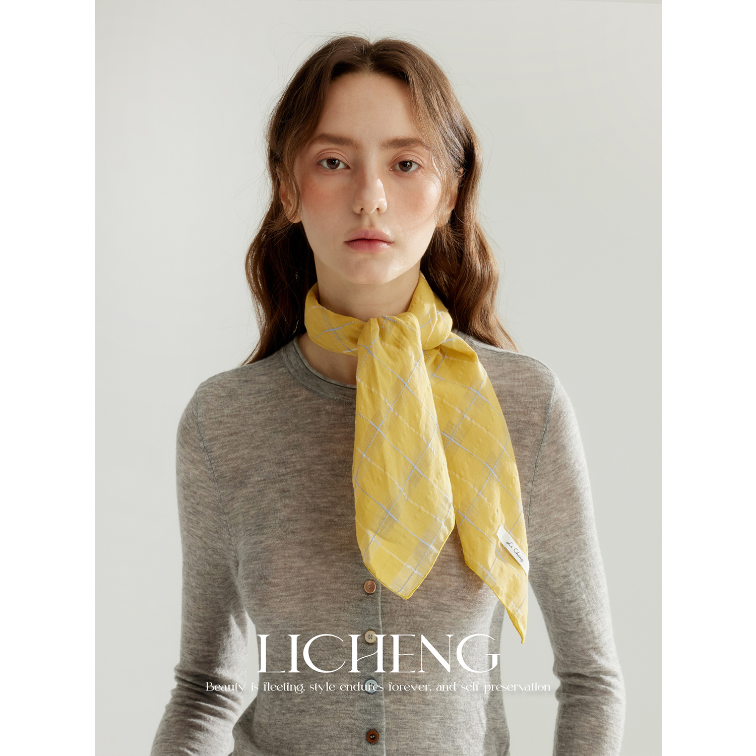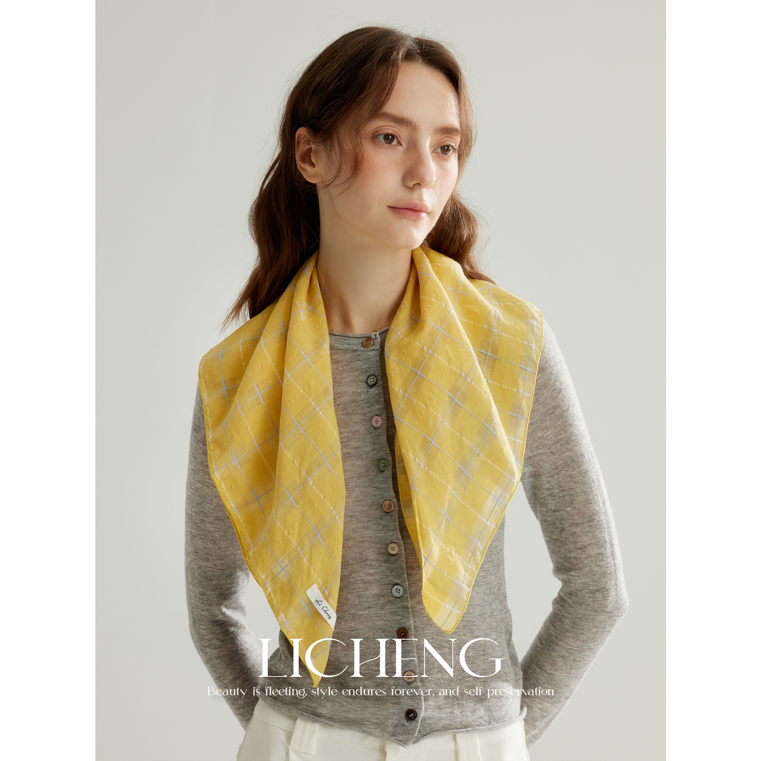 礼诚原创 温柔浪漫色织暖鹅黄桑蚕丝棉格纹丝巾女春夏头巾小方巾