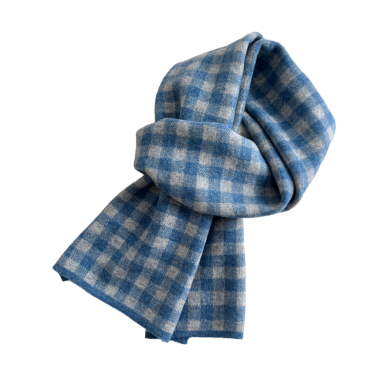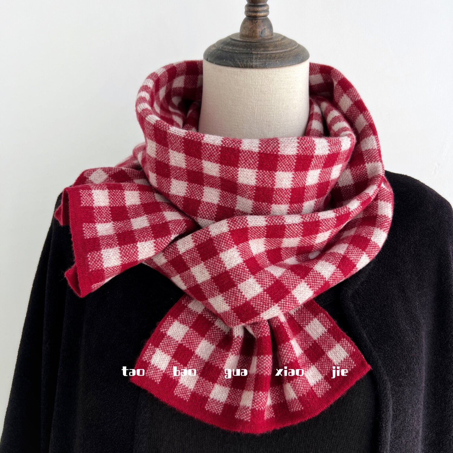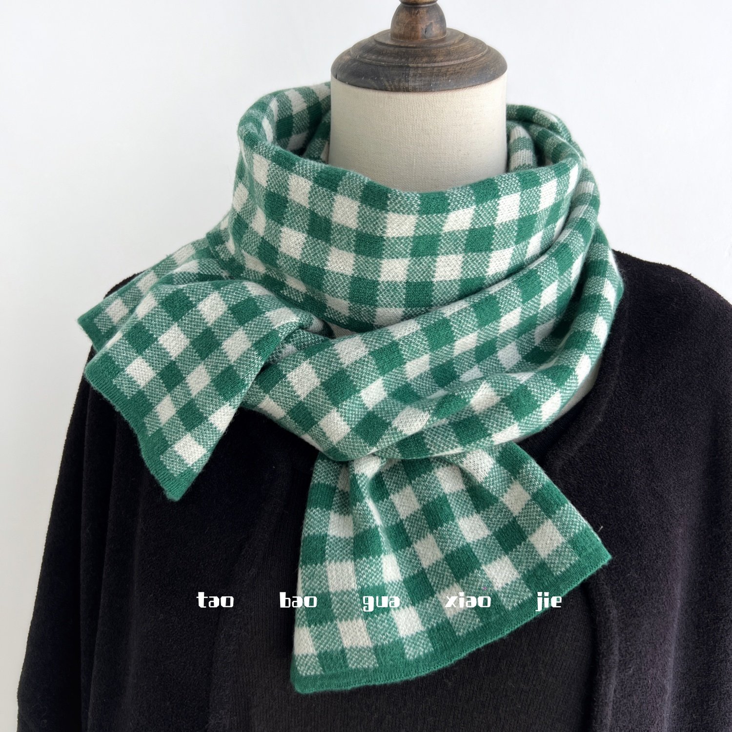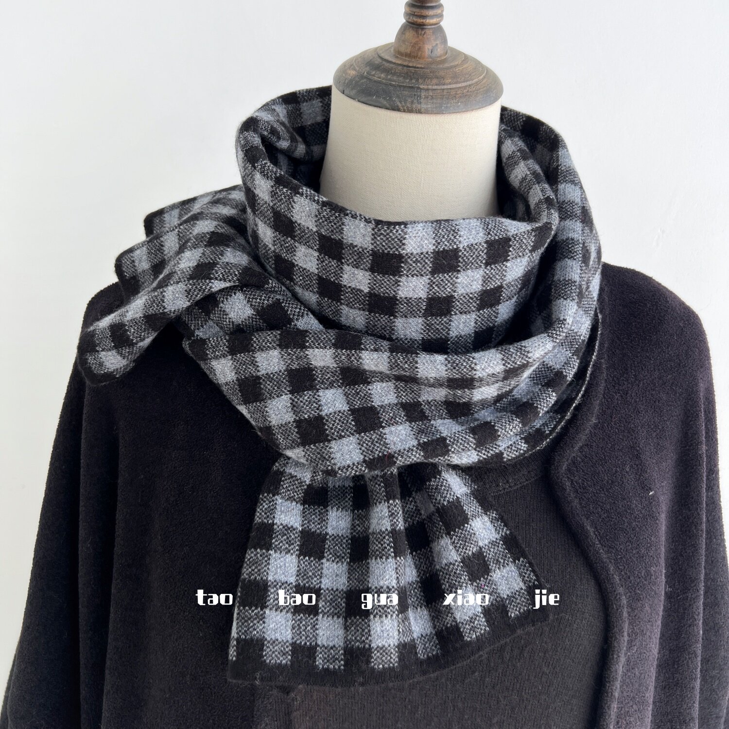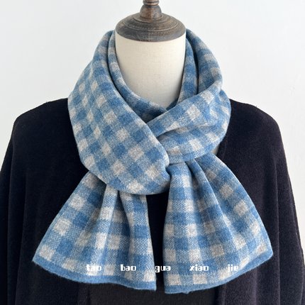 100%纯羊毛蓝色格子围巾女冬季高级感男针织毛线保暖短款小围巾