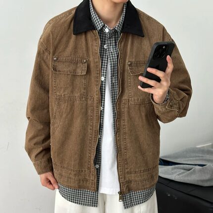 工装外套男女情侣翻领宽松休闲夹克新款复古拼色领美式机车服上衣