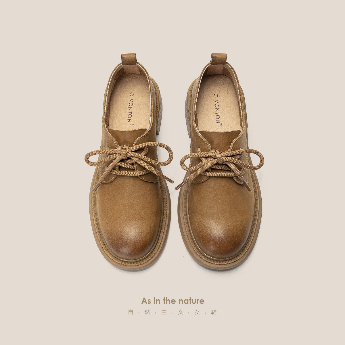 青婉田英伦风粗跟小皮鞋女2024春季新款文艺复古女鞋真皮深口单鞋