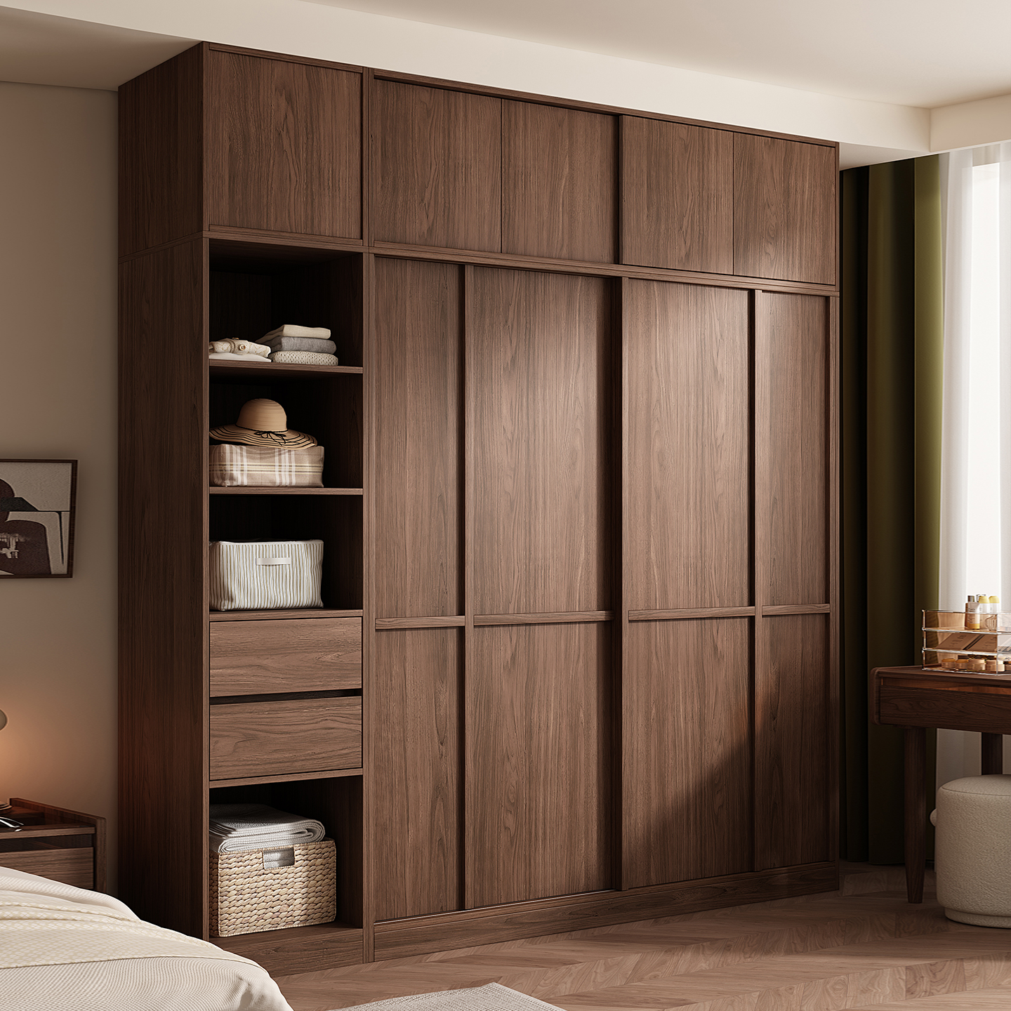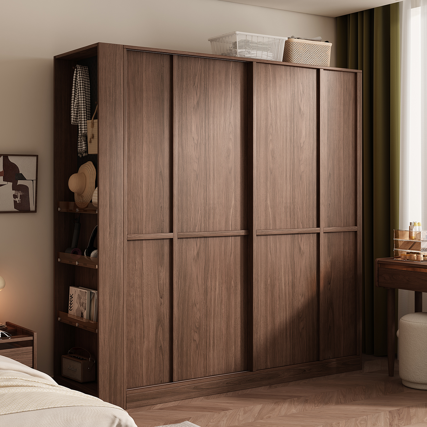 木兜家具格序衣柜胡桃色卧室小户型实木骨骼线推拉门中古风大衣橱