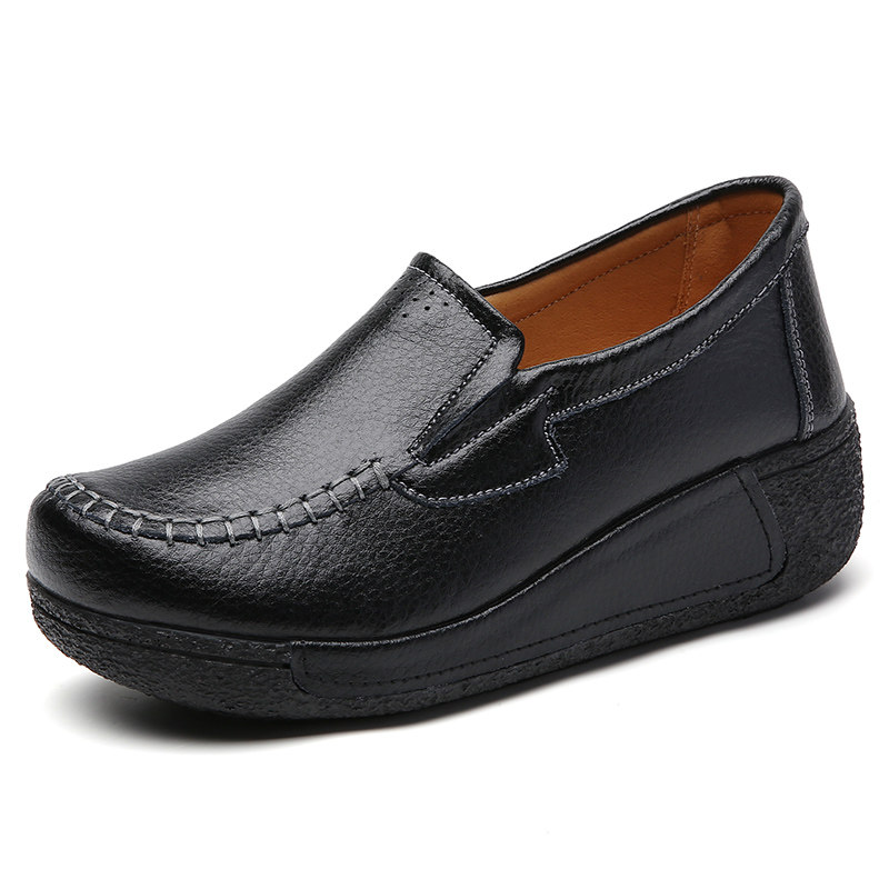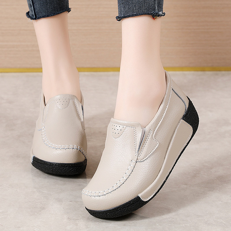 2025春秋款真皮圆头坡跟妈妈摇摇鞋休闲女百搭厚底中跟松糕底单鞋
