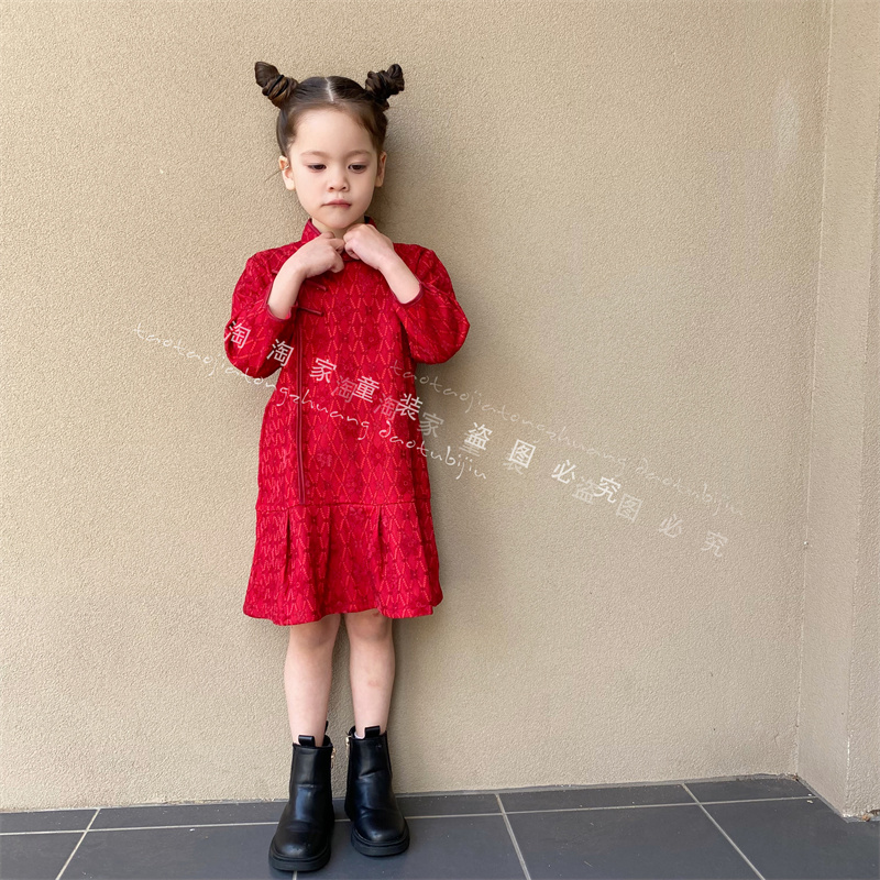 女童长袖旗袍裙子2025款秋冬儿童复古连衣裙中国风唐装红色拜年服