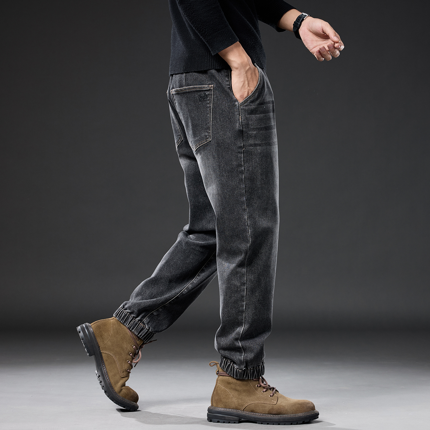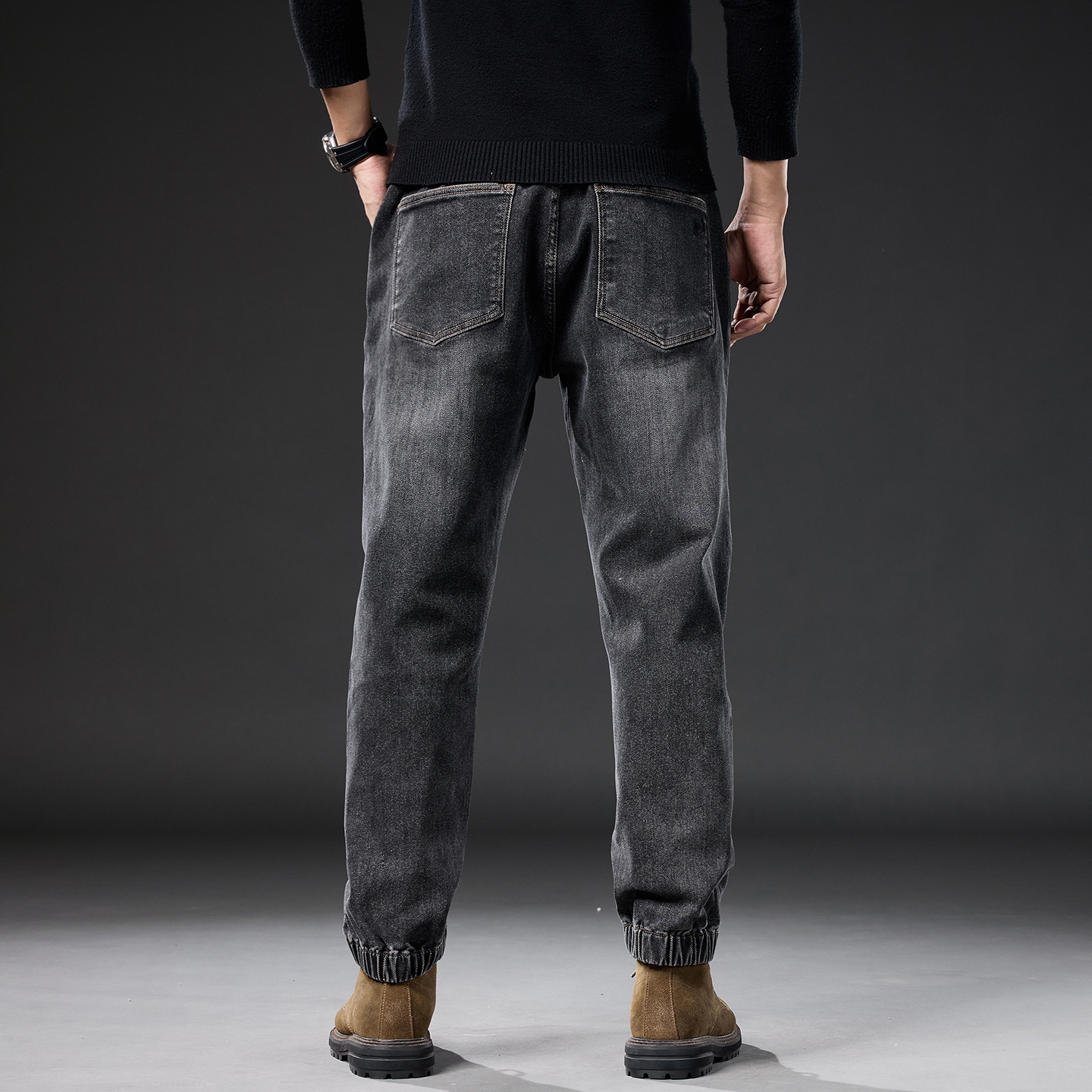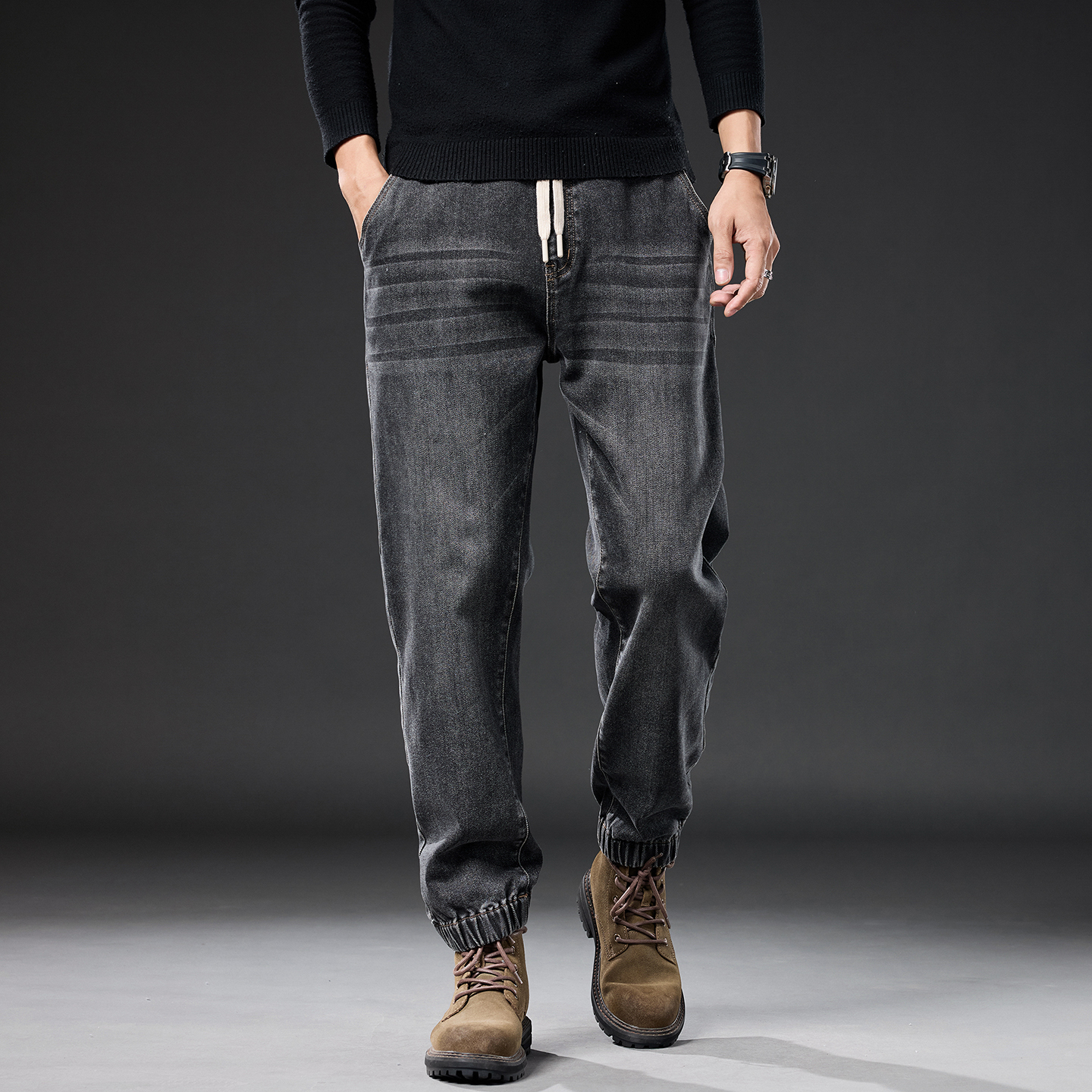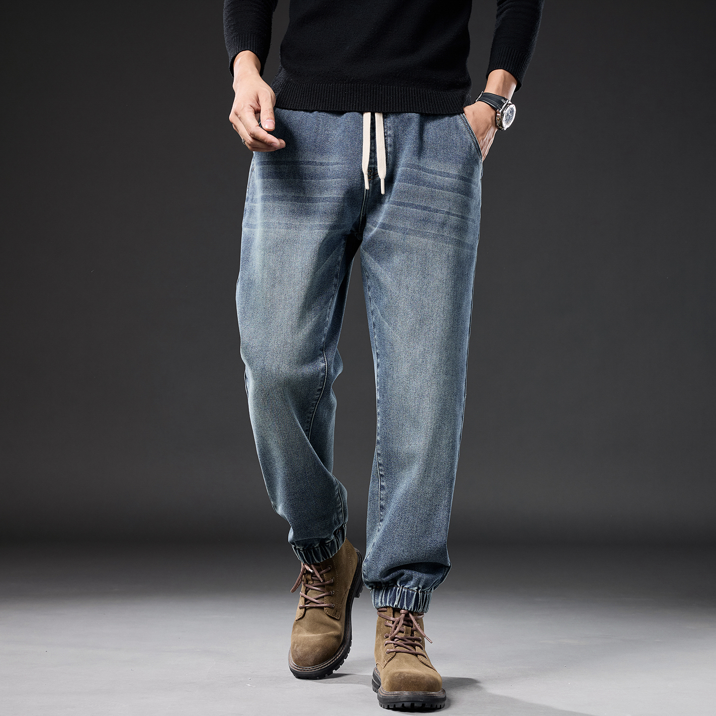 松紧腰牛仔裤男大码宽松束脚收口高弹力青年复古胖子加肥加大厚款